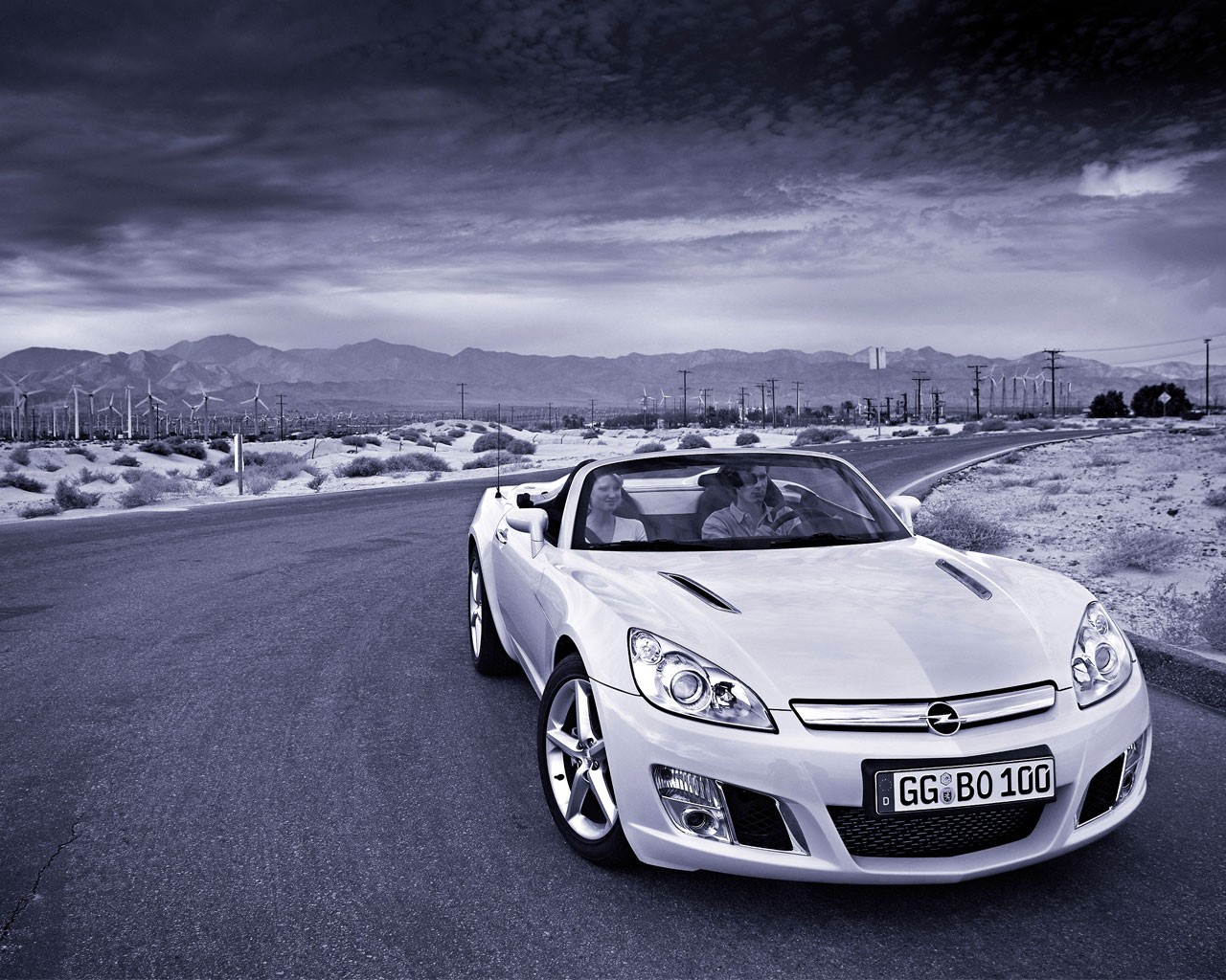 Une Opel décapotable longe les moulins à vent - fond d'écran de bureau