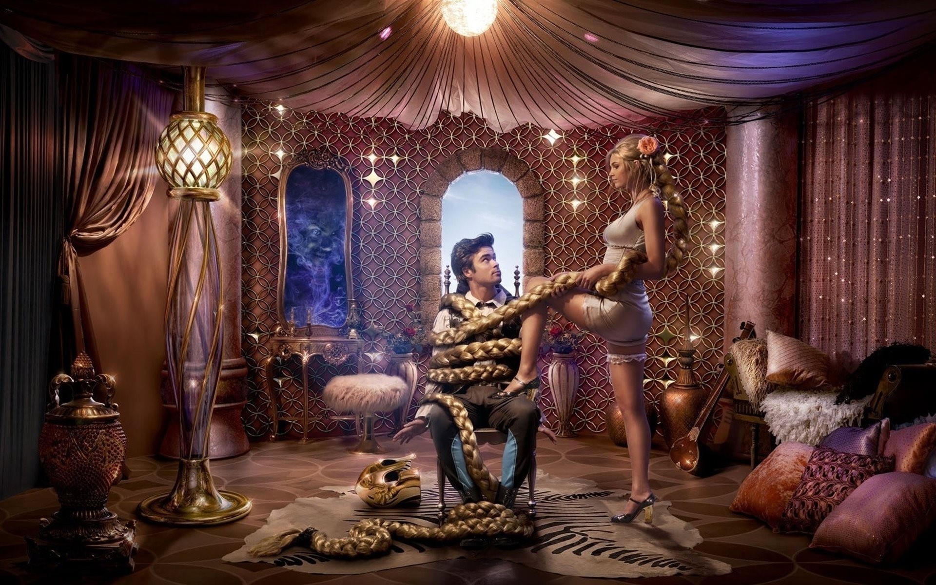 Homme attaché à la chaise d une longue fille oblique - fond d'écran de bureau