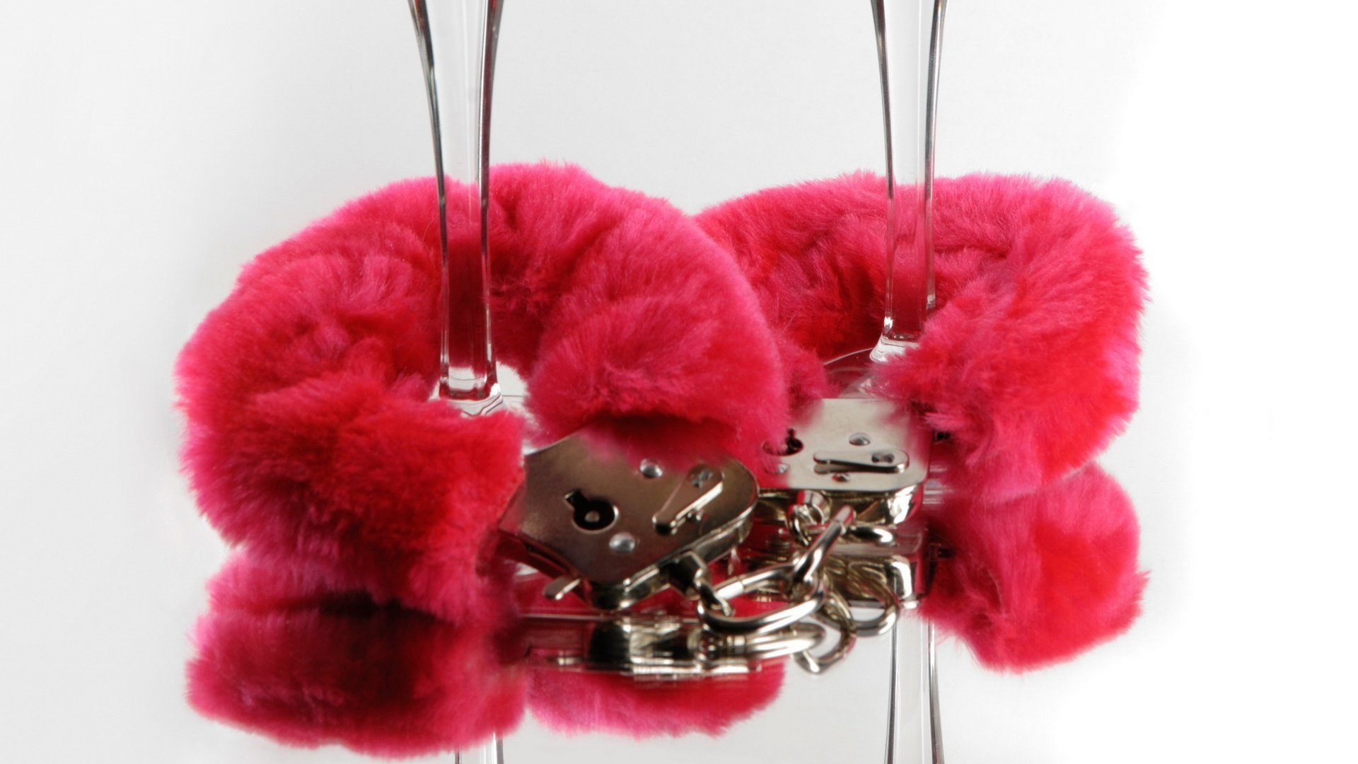Menottes avec fourrure rouge fixés sur les jambes des verres à vin sur fond blanc