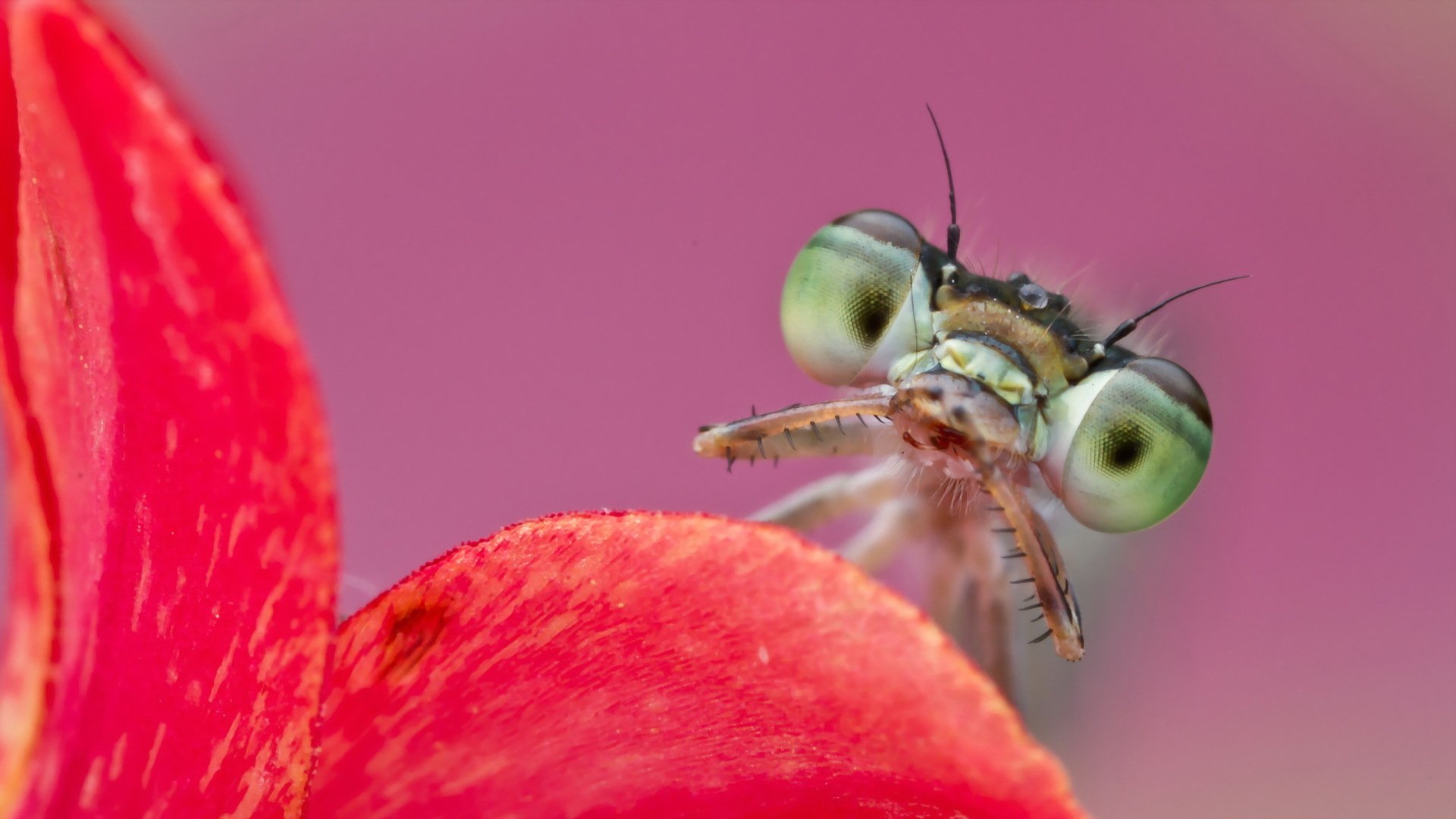 Citrine aux yeux verts sur une fleur écarlate - fond d'écran de bureau