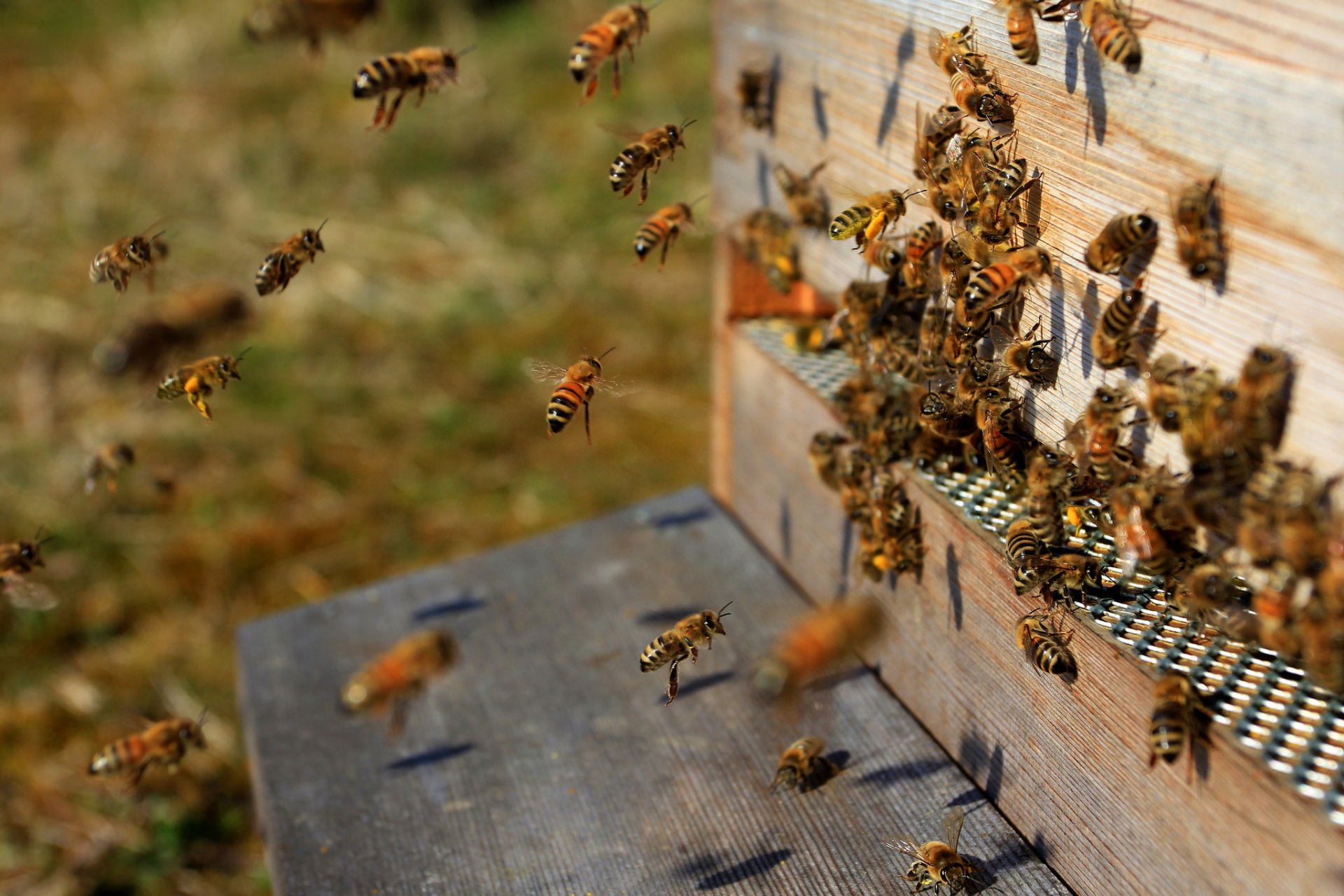 Essaim d abeilles près de sa ruche - fond d'écran de bureau