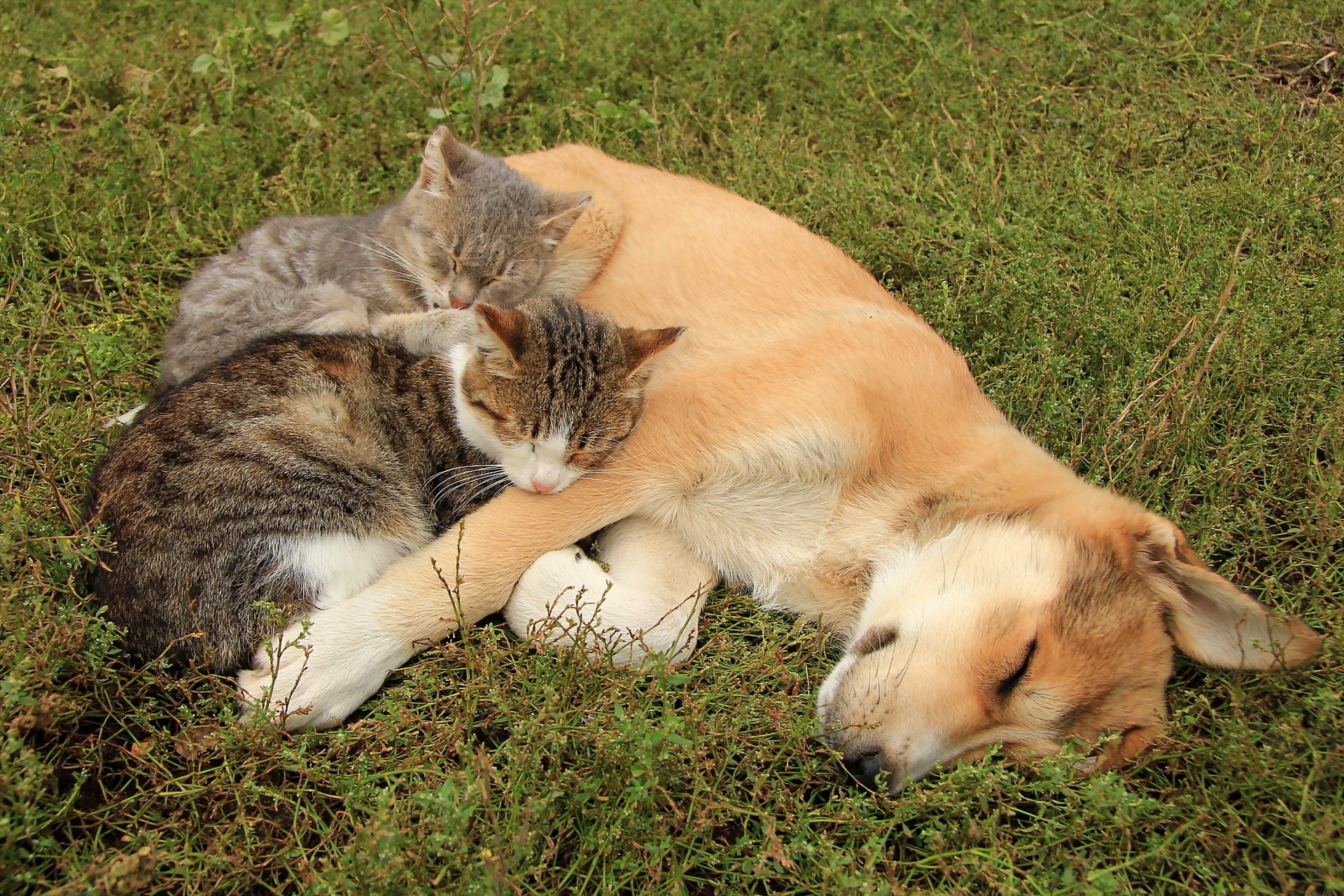 Les deux phoques sont mignons blottis contre le chien et dorment avec elle - fond d'écran de bureau