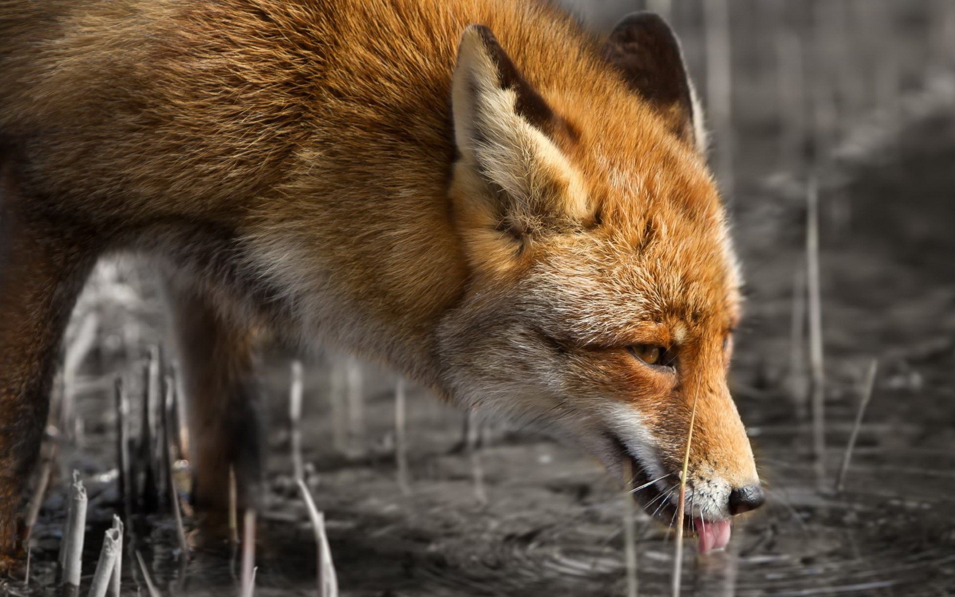 Renard roux lacant l eau du réservoir - fond d'écran de bureau