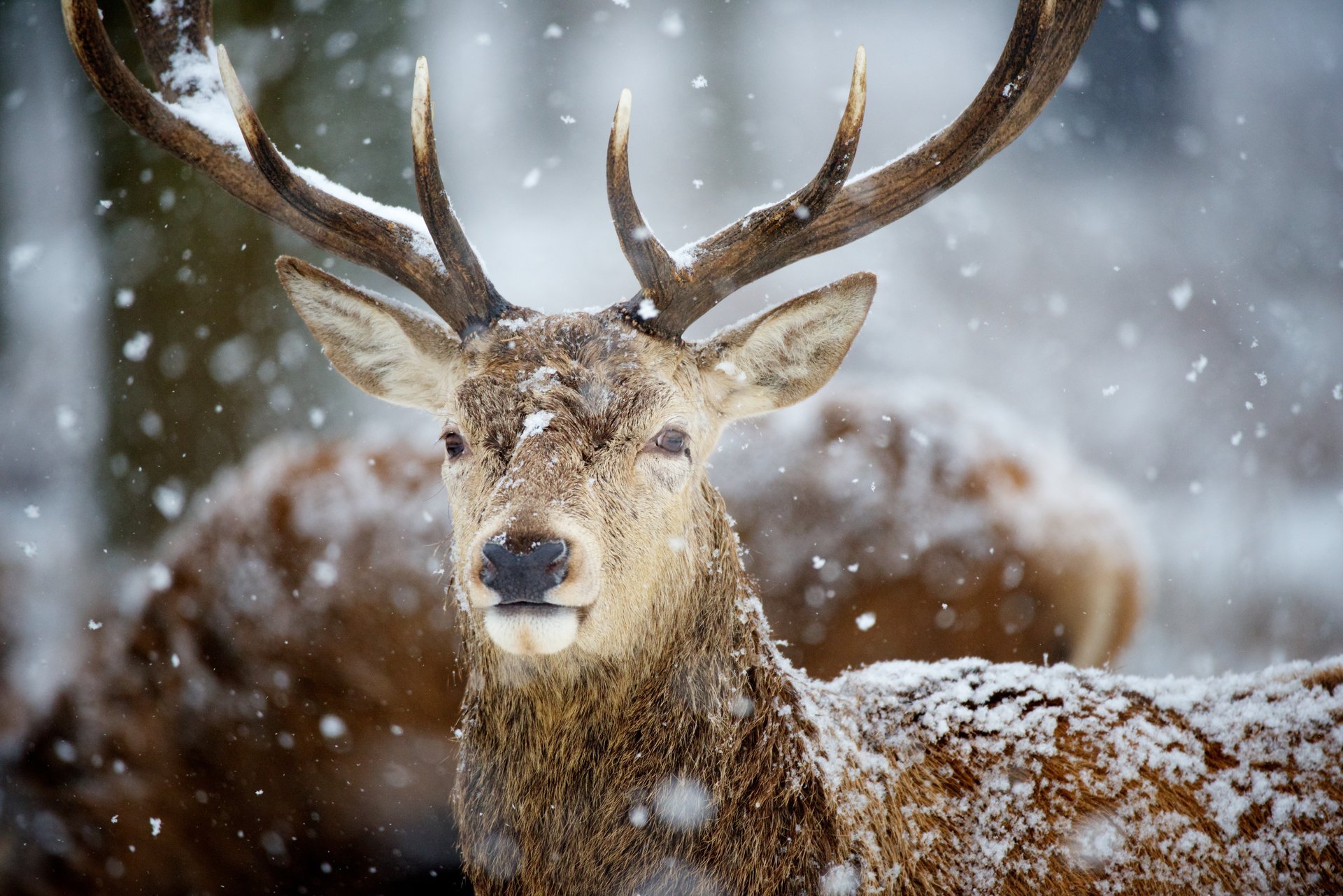 Cerf avec de grandes cornes sur fond de neige qui tombe - fond d'écran de bureau