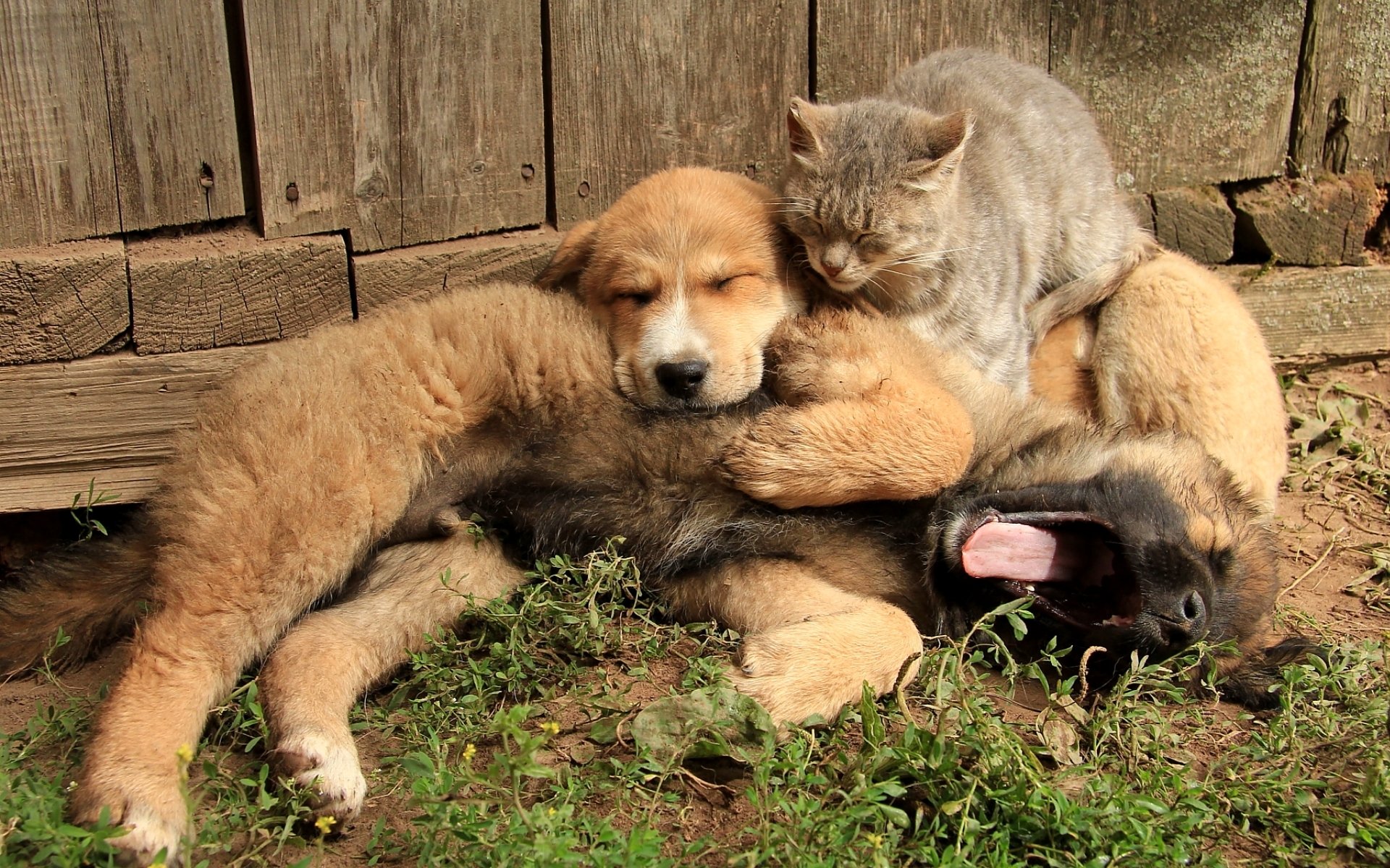 Sur un gros chien se trouvent un chien et un chat - fond d'écran de téléphone