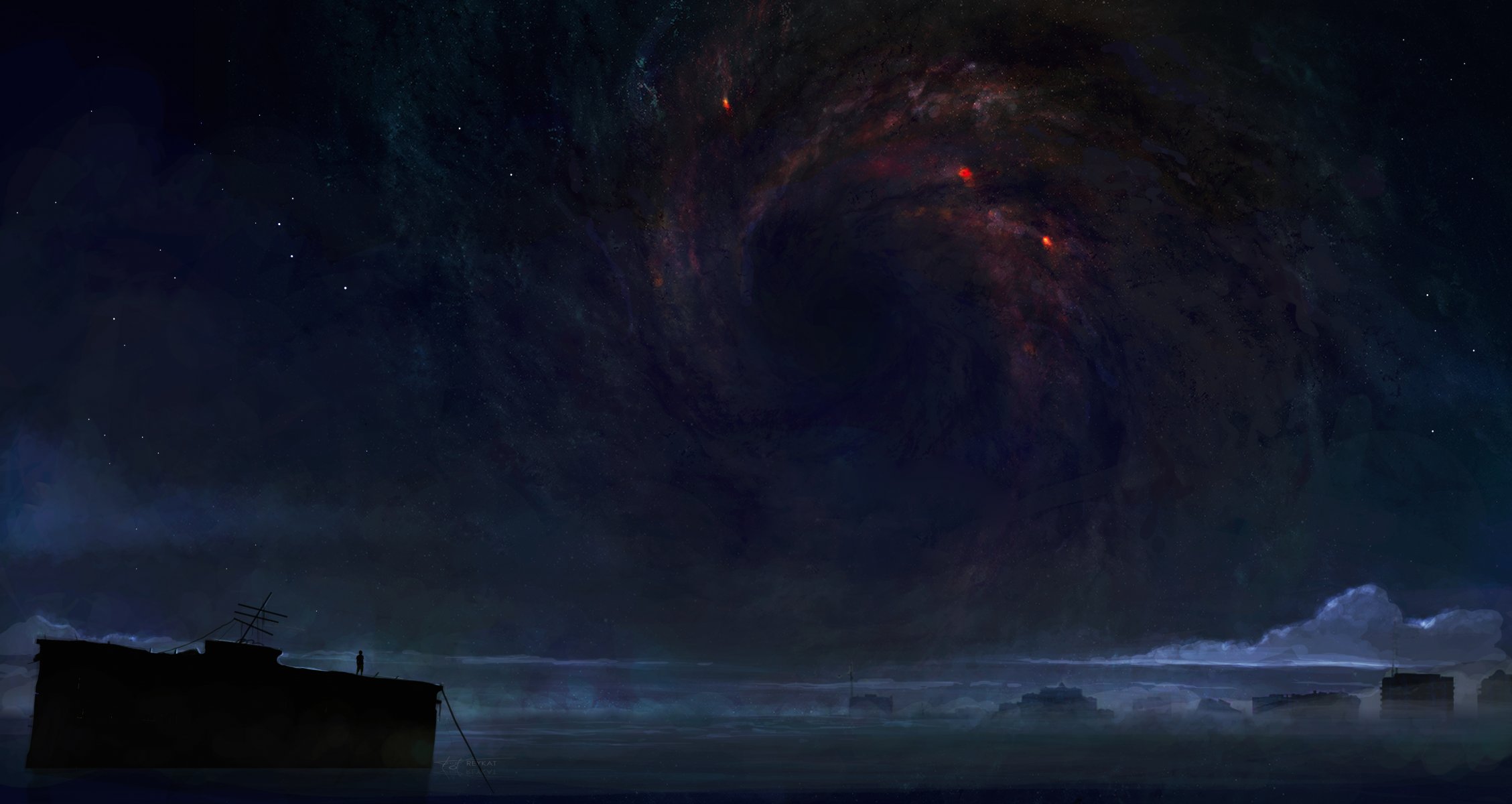 Tags:ciel, ville, homme, toits, étoiles, antenne