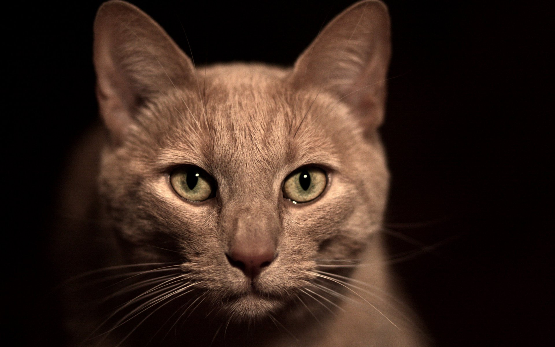 beige chat gros plan museau yeux verts moustache nez fond noir
