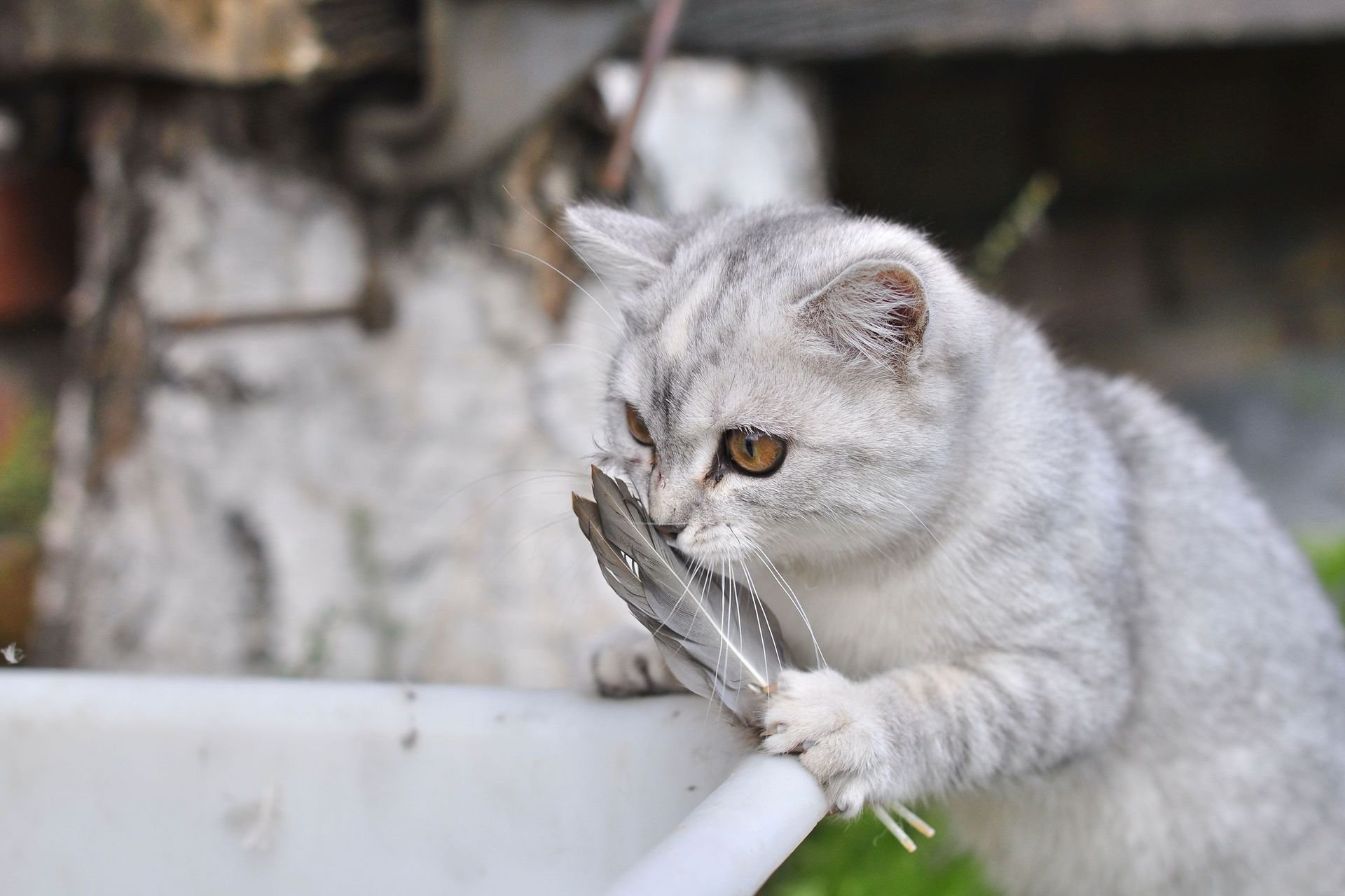 Beau chaton blanc avec des plumes dans les pattes - fond d'écran de téléphone