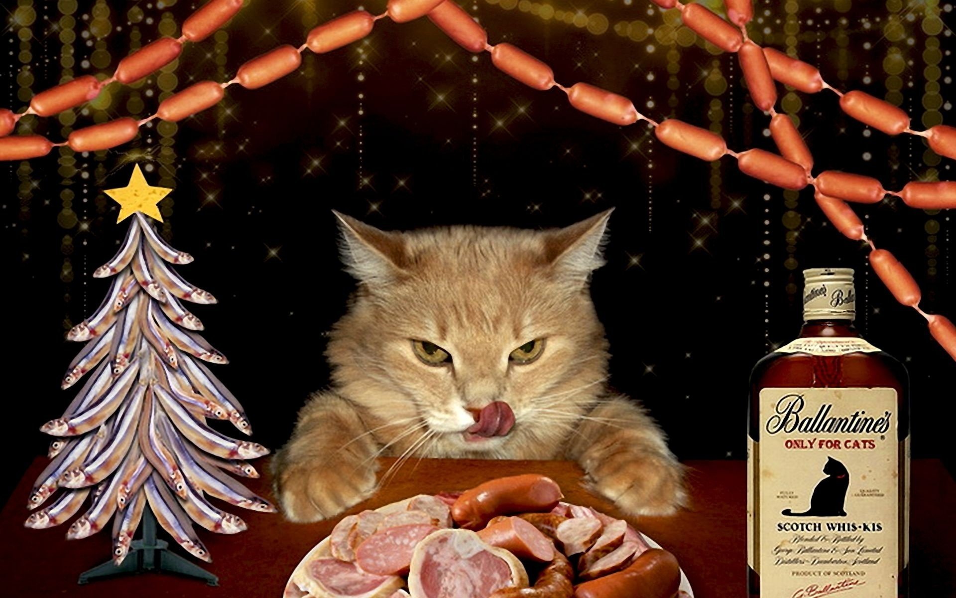 Fête chez le chat. Table du nouvel an - fond d'écran de téléphone