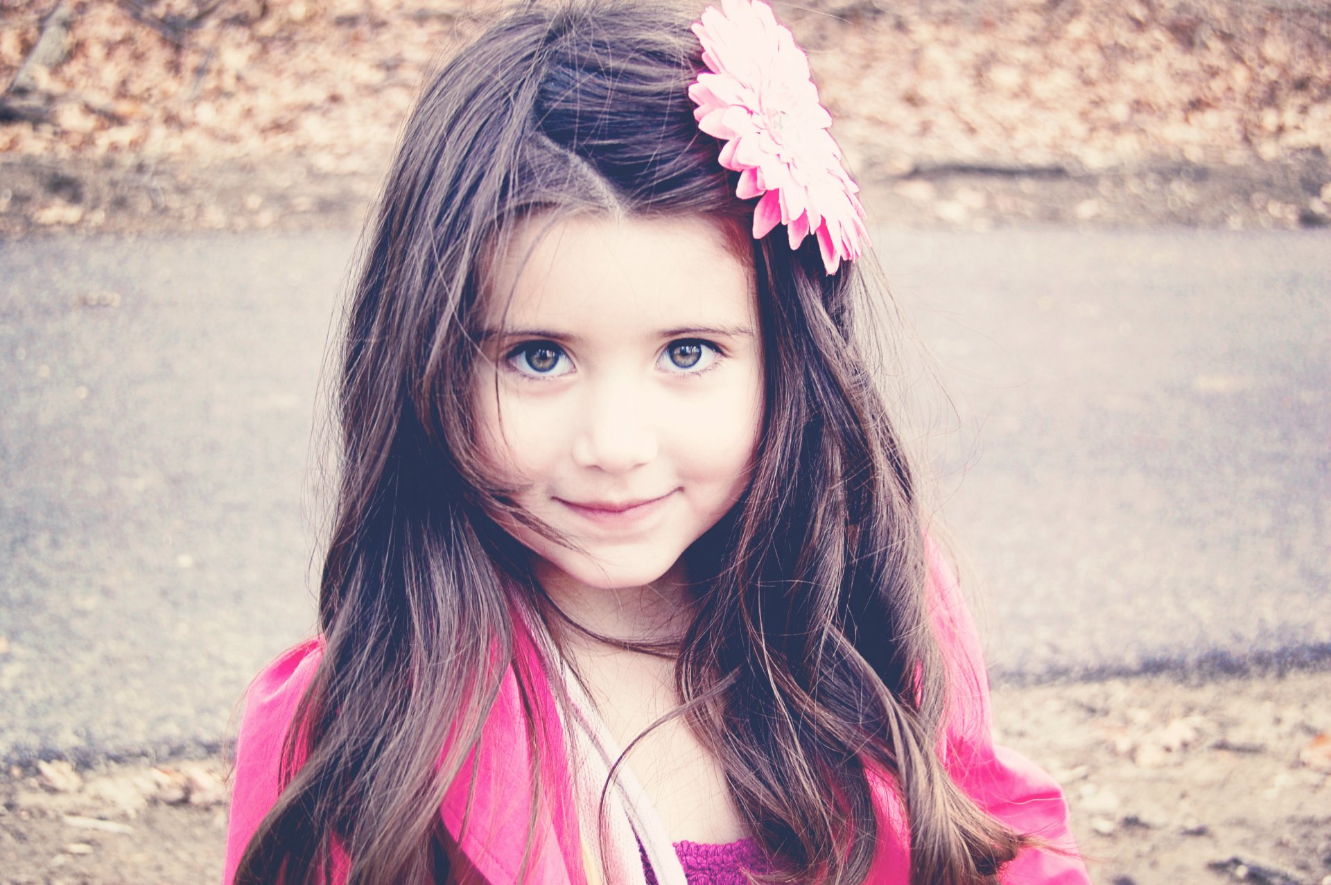 divers humeurs enfants fille cheveux brunette visage regard sourire décoration fleur rose fond fond d écran widescreen plein écran