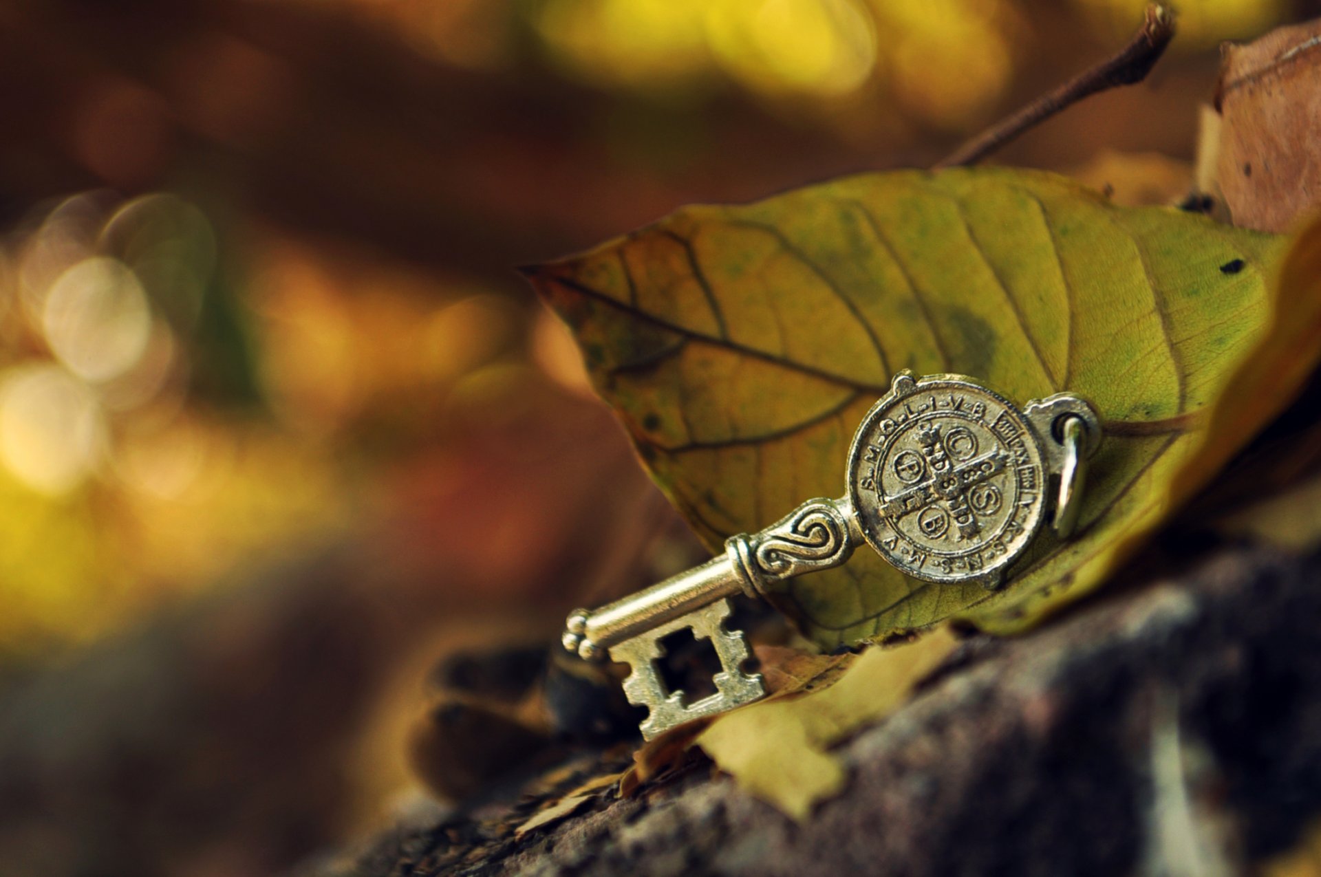 Clé en métal sur le feuillage - fond d'écran de bureau