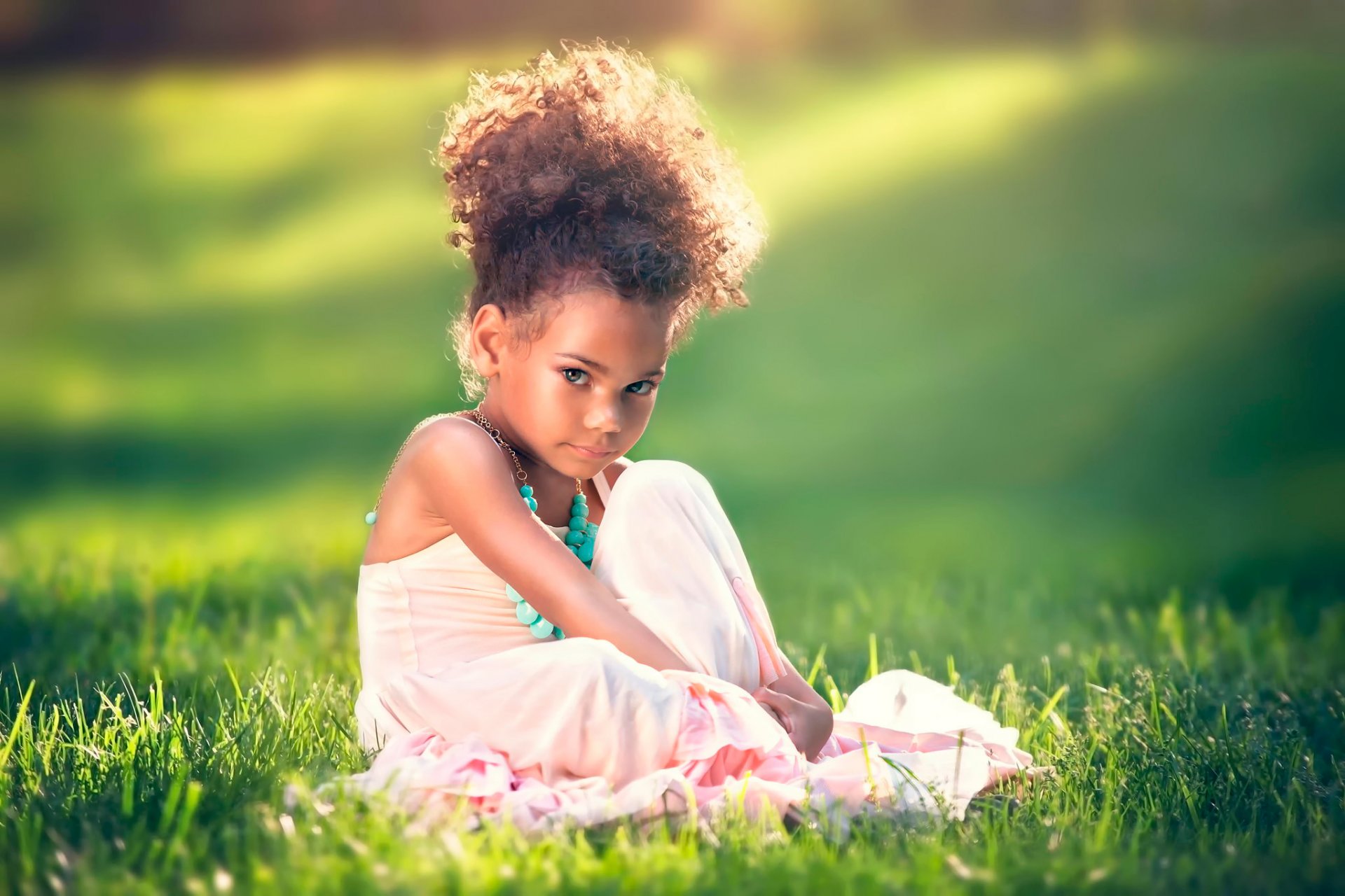 Fille bouclée assise sur l herbe - fond d'écran de bureau