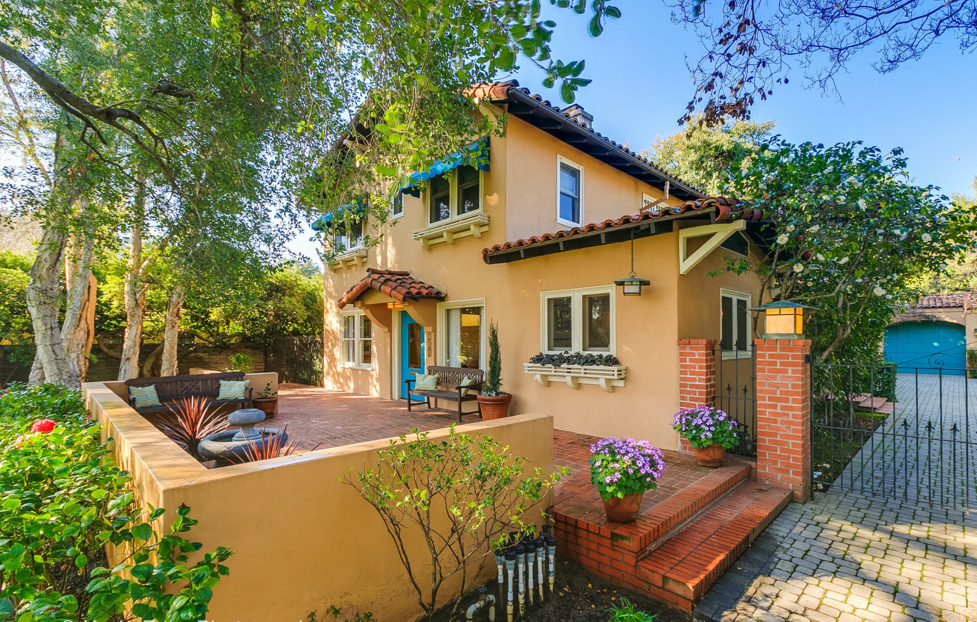 Tags:cour, maison, porte, arbres, fleurs, porche, banc, ciel