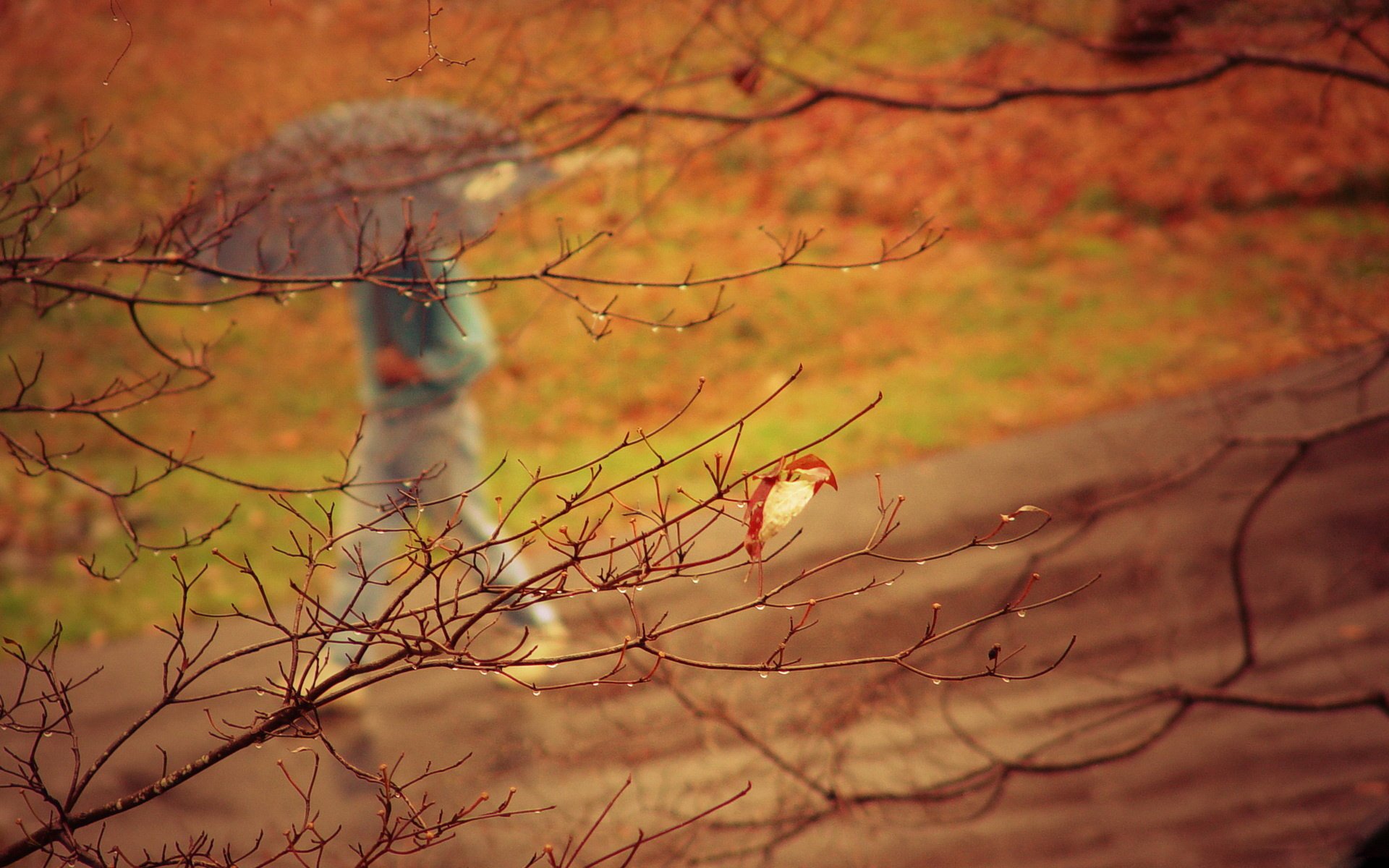 ner cov macro automne silhouette route terre herbe hauteur arbre branches gouttes pluie homme parapluie