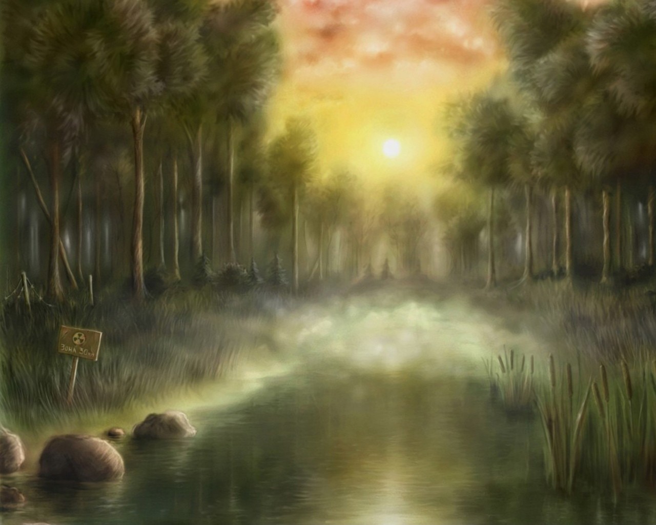 Paysage de marais radioactifs au coucher du soleil - fond d'écran de téléphone
