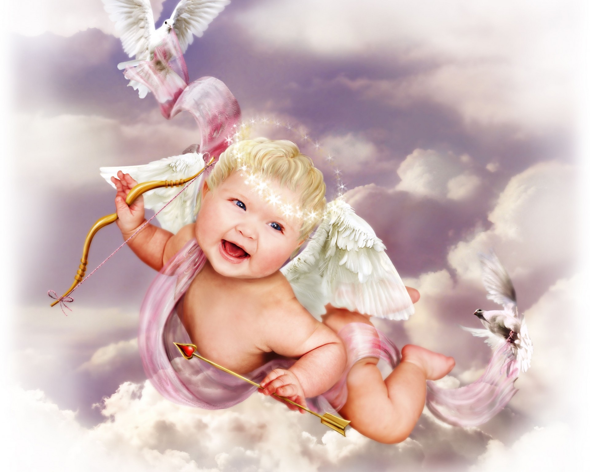 Tags:garçon, colombe, cupidon, arc, nuages, flèche