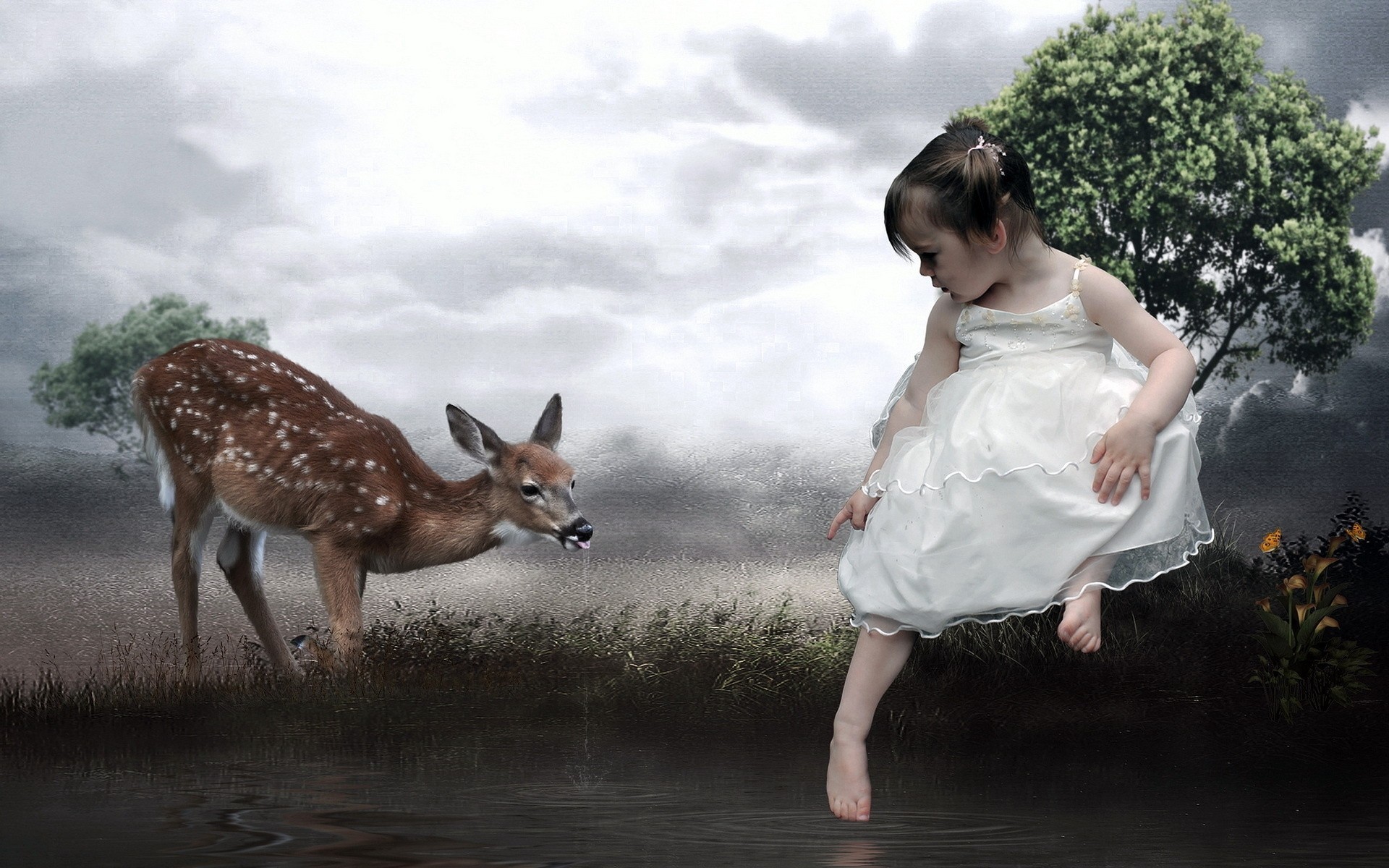 Petite fille en robe blanche et cerf - fond d'écran de téléphone