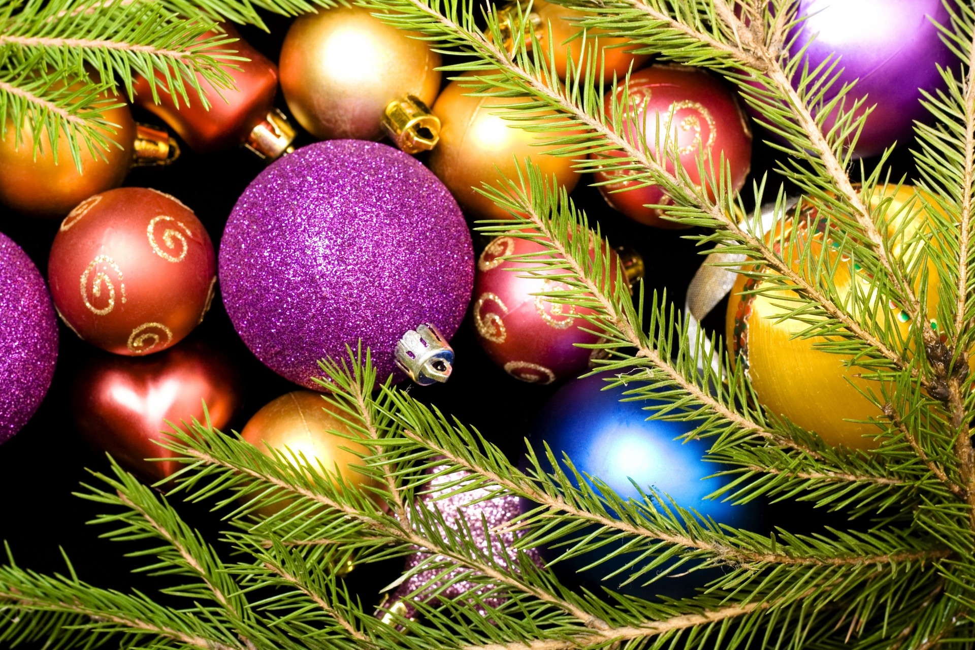 Jouets de Noël multicolores encadrés par des branches de sapin - fond d'écran de bureau
