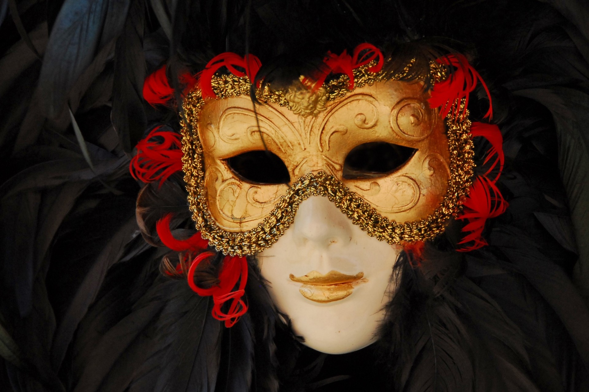 Masque d or sur fond de plumes noires - fond d'écran de bureau