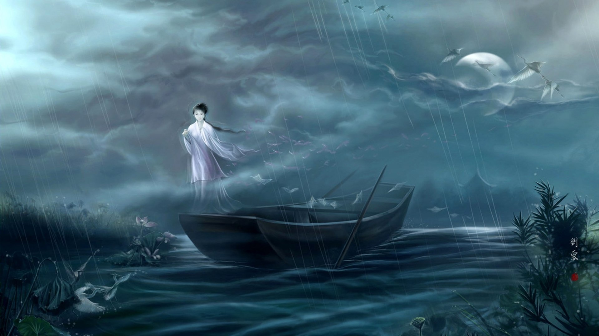 art japon maison nuit lune brouillard pluie rivière grues bateau fille esprit