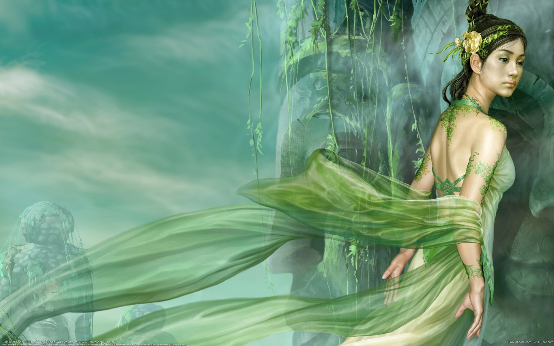 Belle fille de la forêt en robe verte, autour de la brume - fond d'écran de bureau