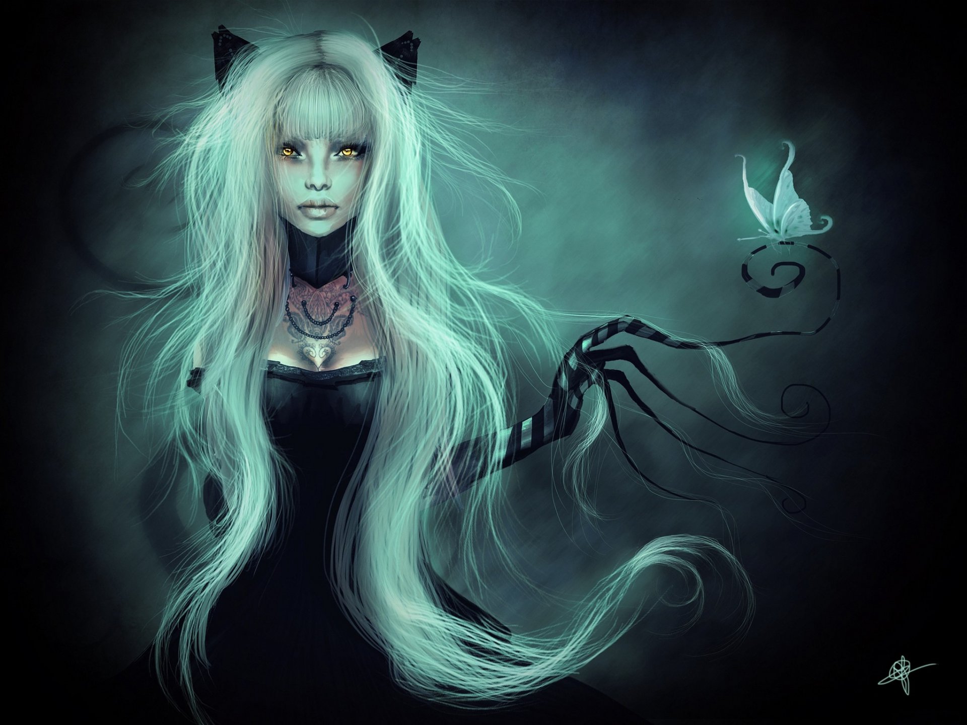 Catwoman avec des tatouages et des oreilles avec des cheveux longs - fond d'écran de bureau