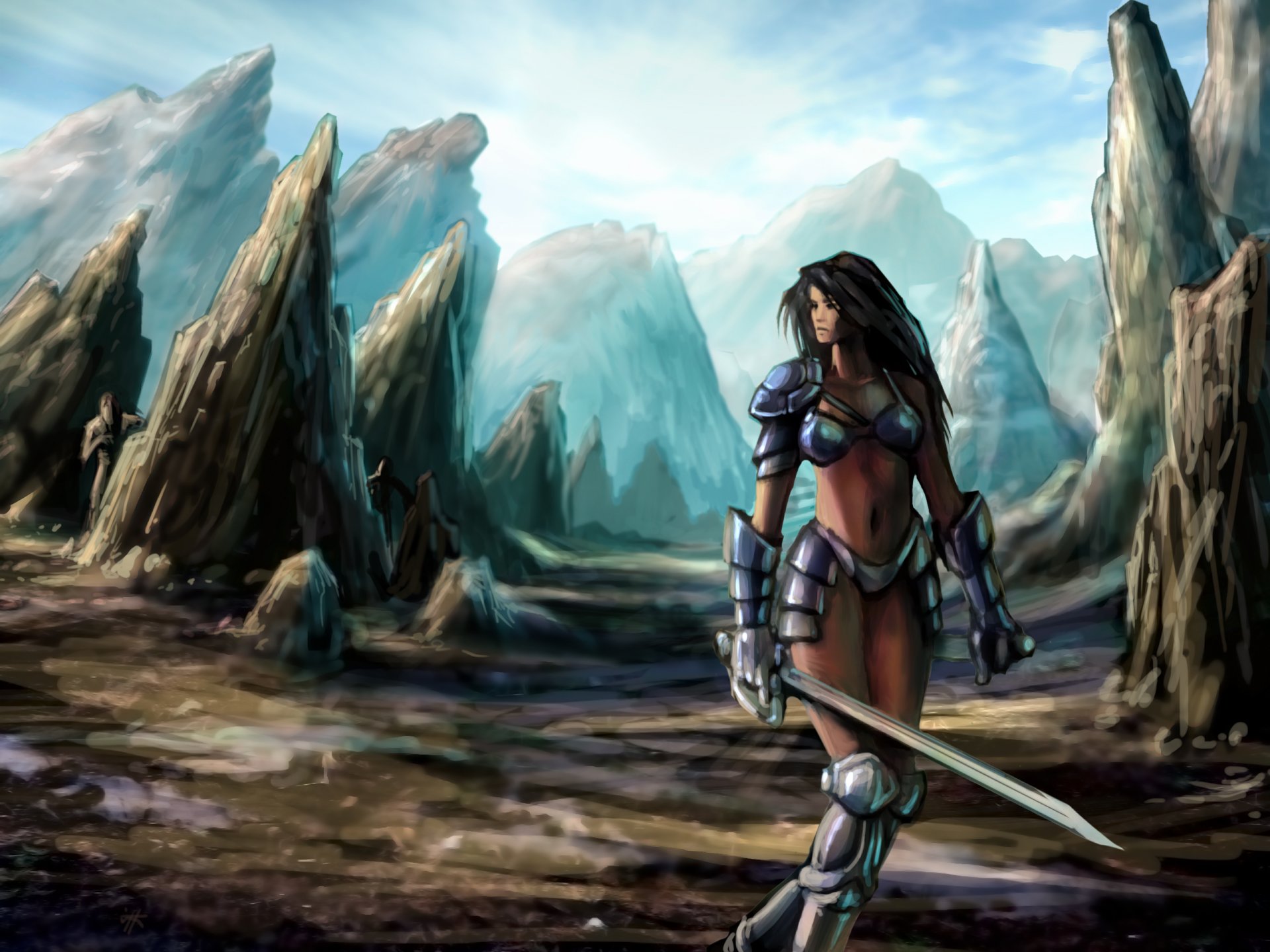 Fille en armure sur fond de rochers - fond d'écran de bureau