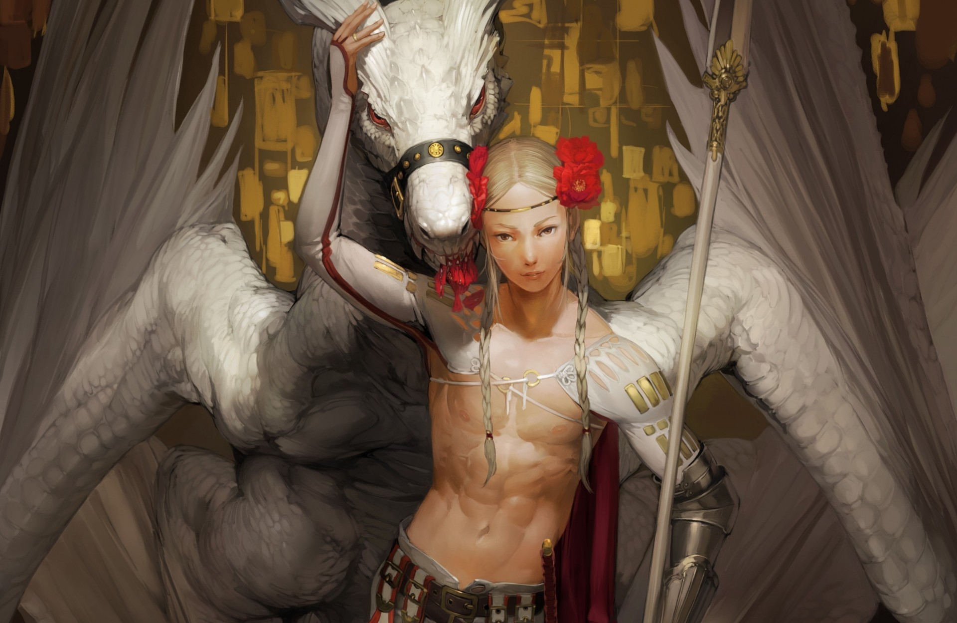 Tags:art, tresses, fleurs, monstre, ailes, lance, homme