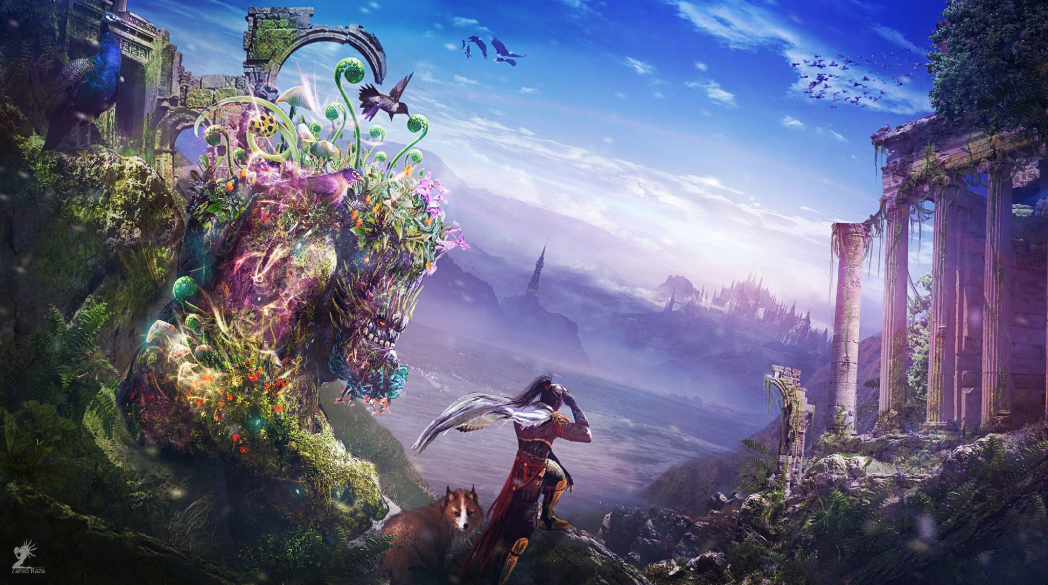Tags:art, zahid raza khan, paysage, monde fantastique, gars, renards, oiseaux, ruines, colibris, monstre, plantes, lac, ville