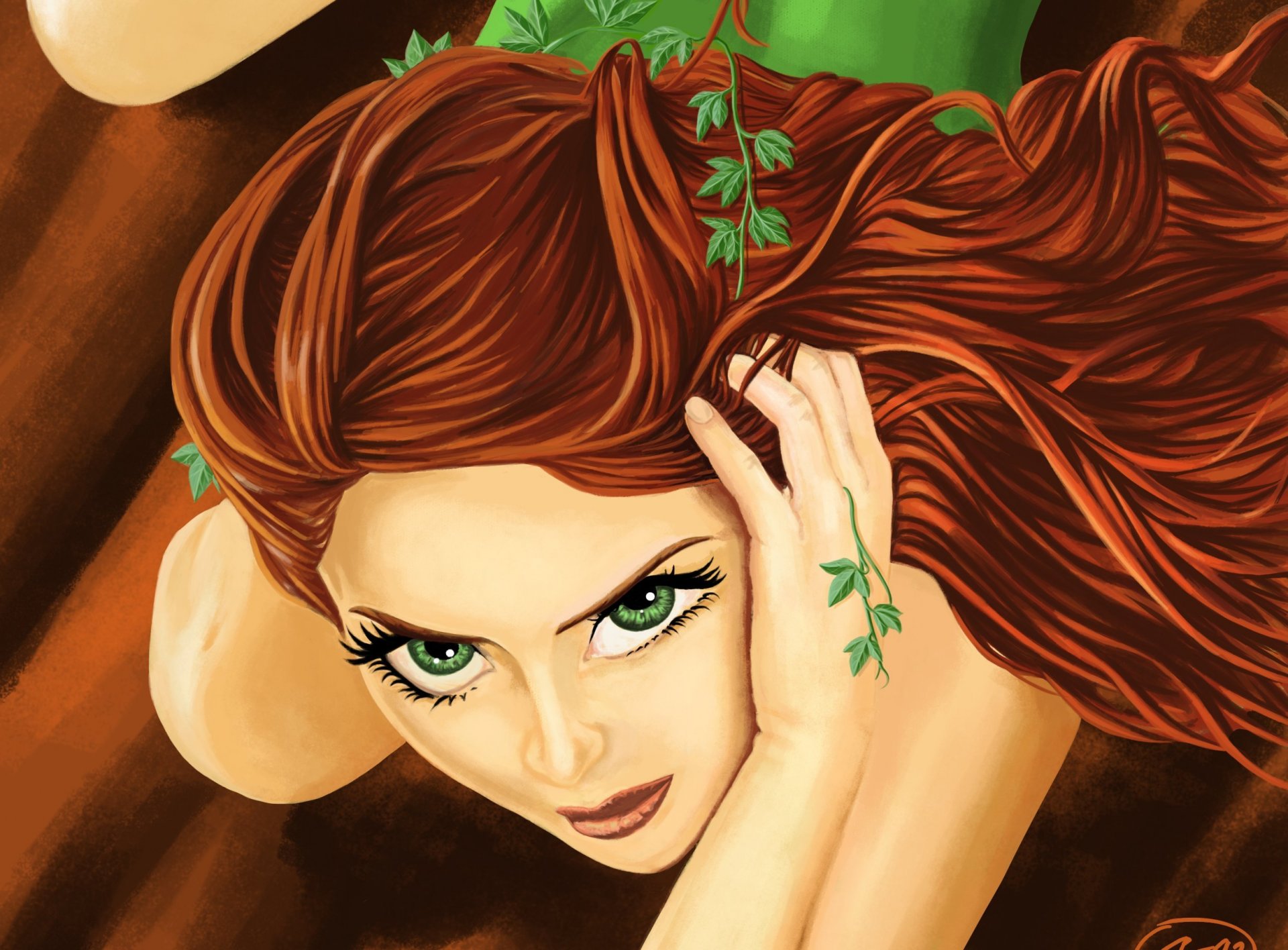 Tags:sumac vénéneux, dc comics, poison, pamela lilian aisley, pamela lilian aisley, art, visage, yeux verts, regard, cheveux, mains, plantes