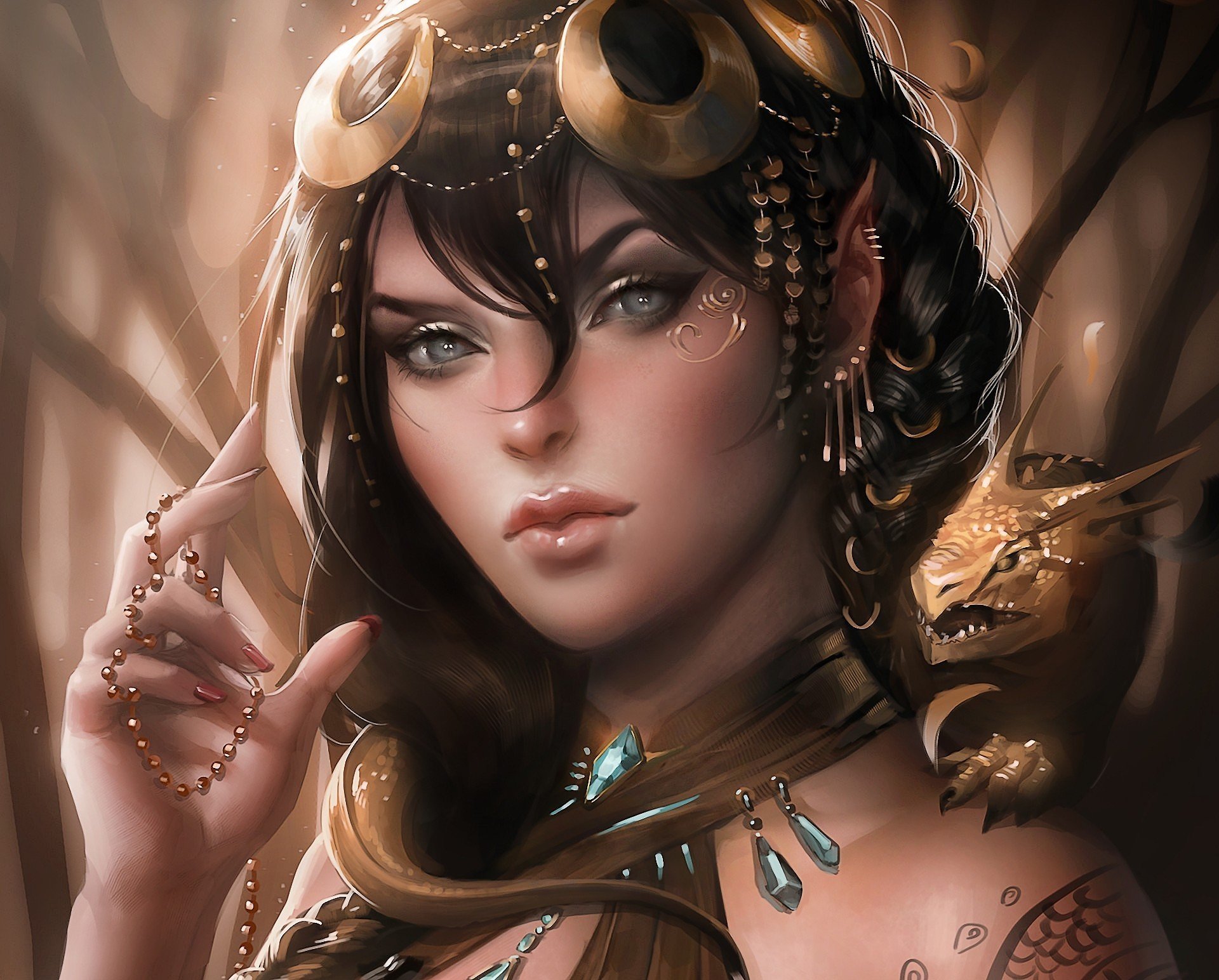 Tags:art, sakimichan, fille, dragon, bijoux, oreilles, elfe, perles