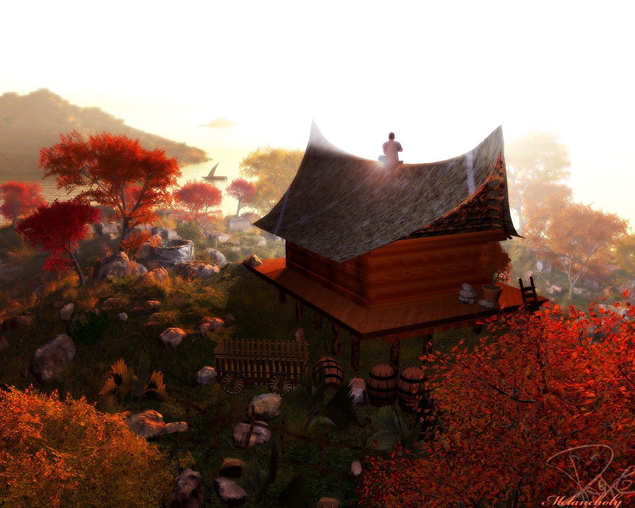 Petite maison dans les montagnes entouré d arbres - fond d'écran de bureau