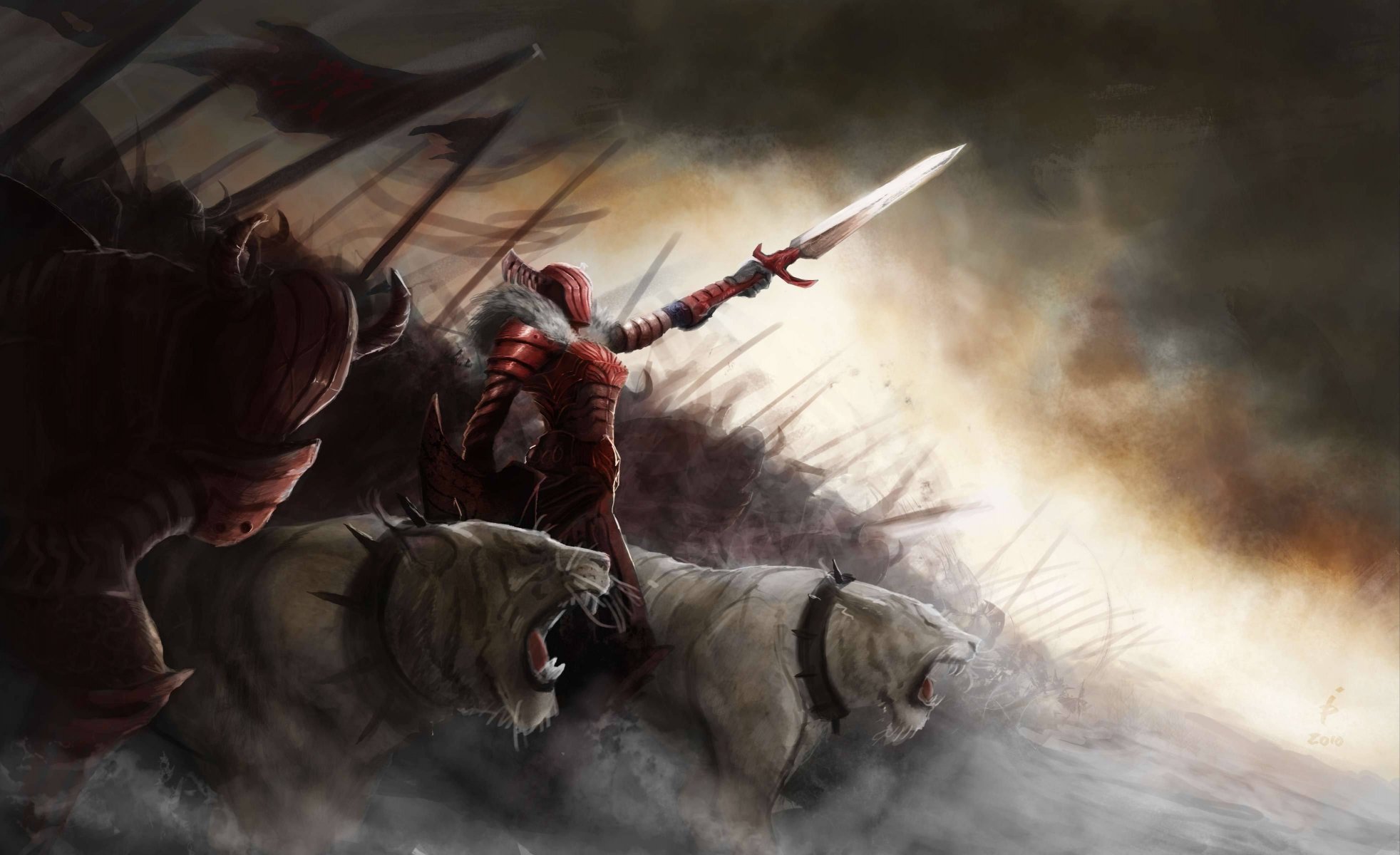 Guerrier rouge avec des tigres blancs apprivoisés - fond d'écran de téléphone