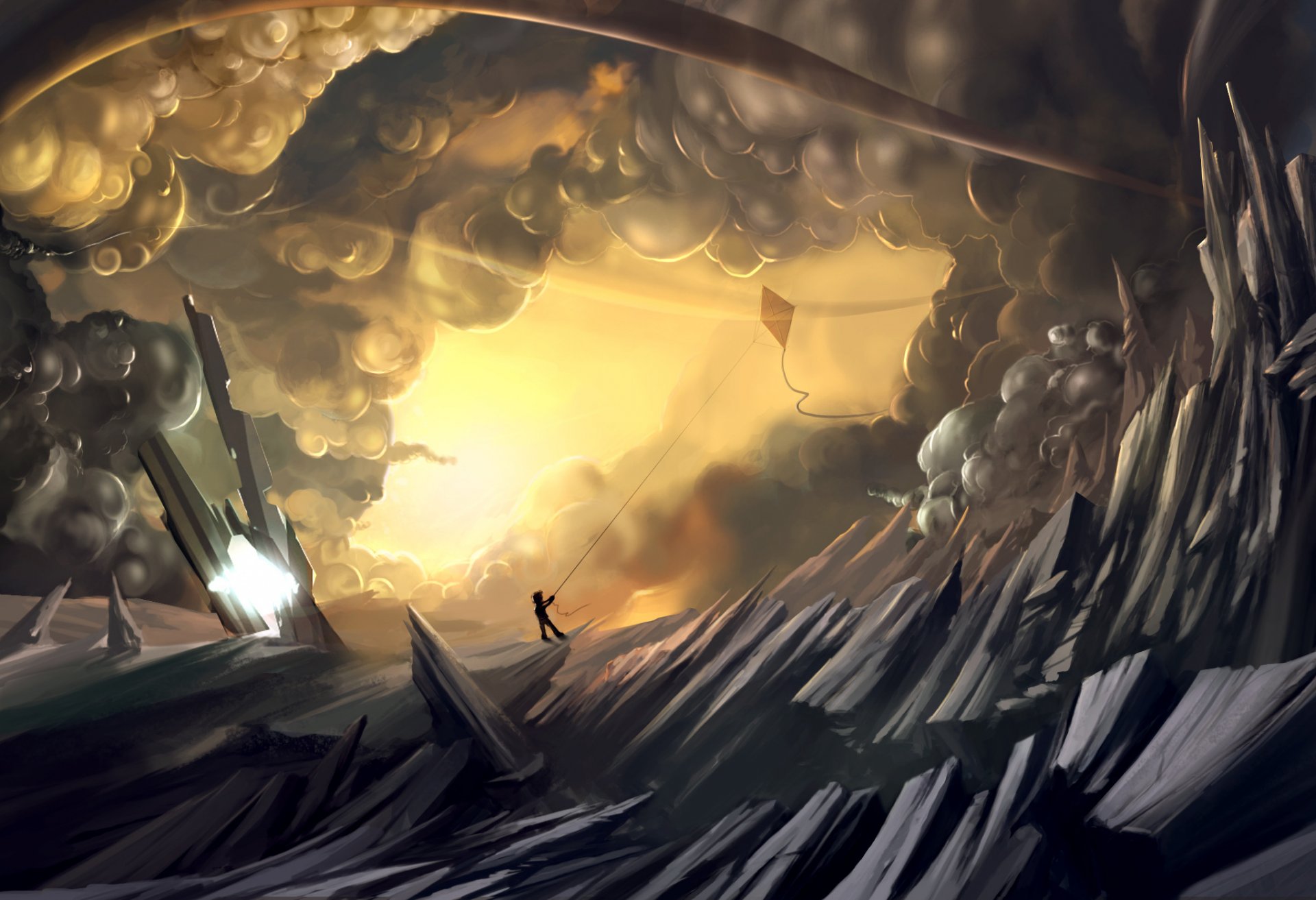 Tags:garçon, montagnes, nuages, aérien, cerf-volant