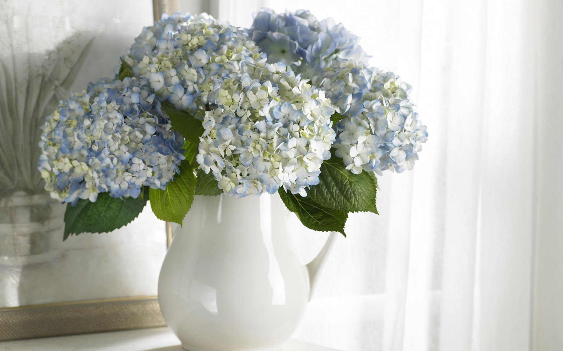Vase blanc avec bouquet d hortensia - fond d'écran de bureau