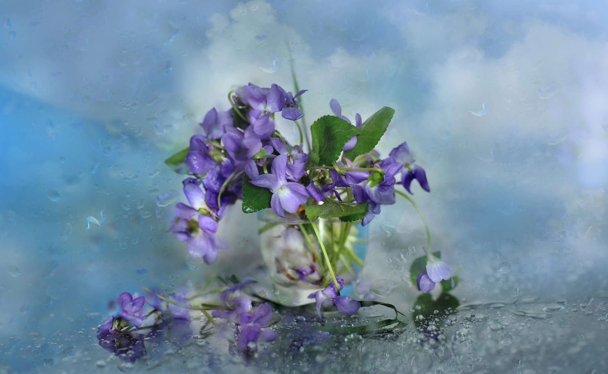 Tags:gouttes, verre, fleurs, verdure, gros plan
