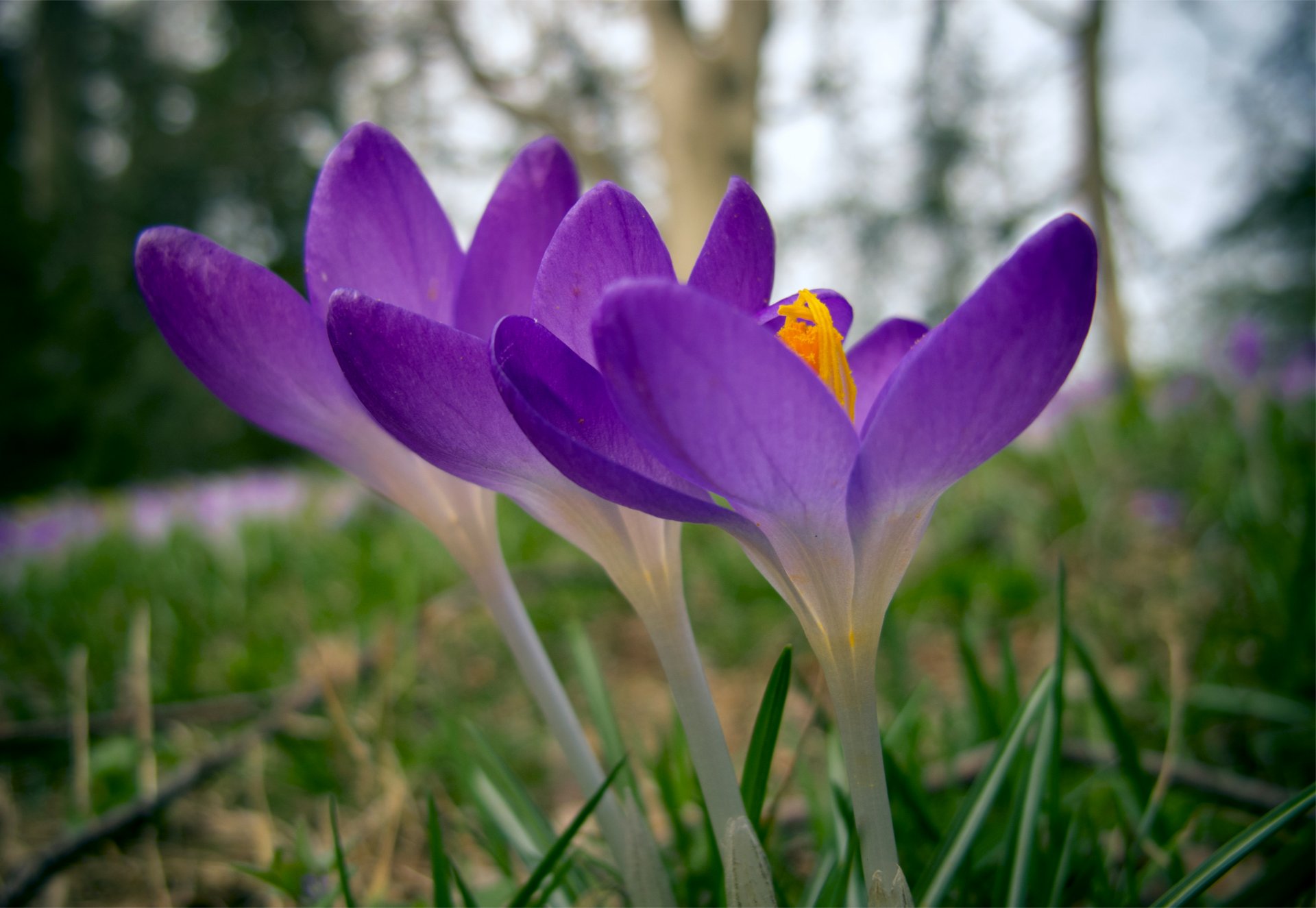 crocus trois fleurs lilas herbe forêt clairière printemps gros plan flou