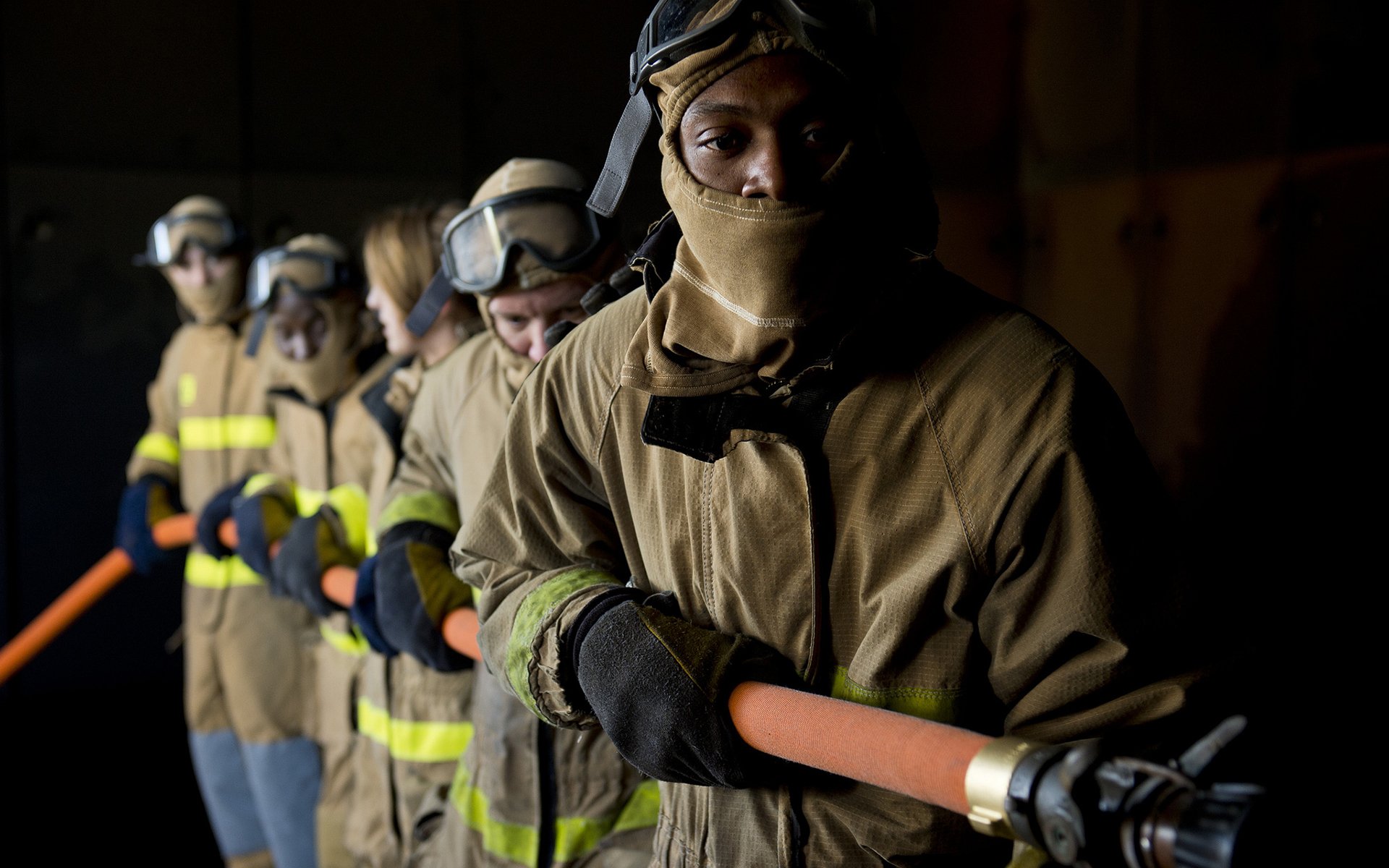 Cinq pompiers tiennent le tuyau - fond d'écran de bureau