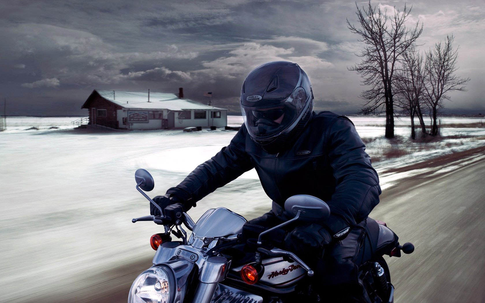 Guy dans un casque sur une moto sur fond de paysage d hiver - fond d'écran de bureau