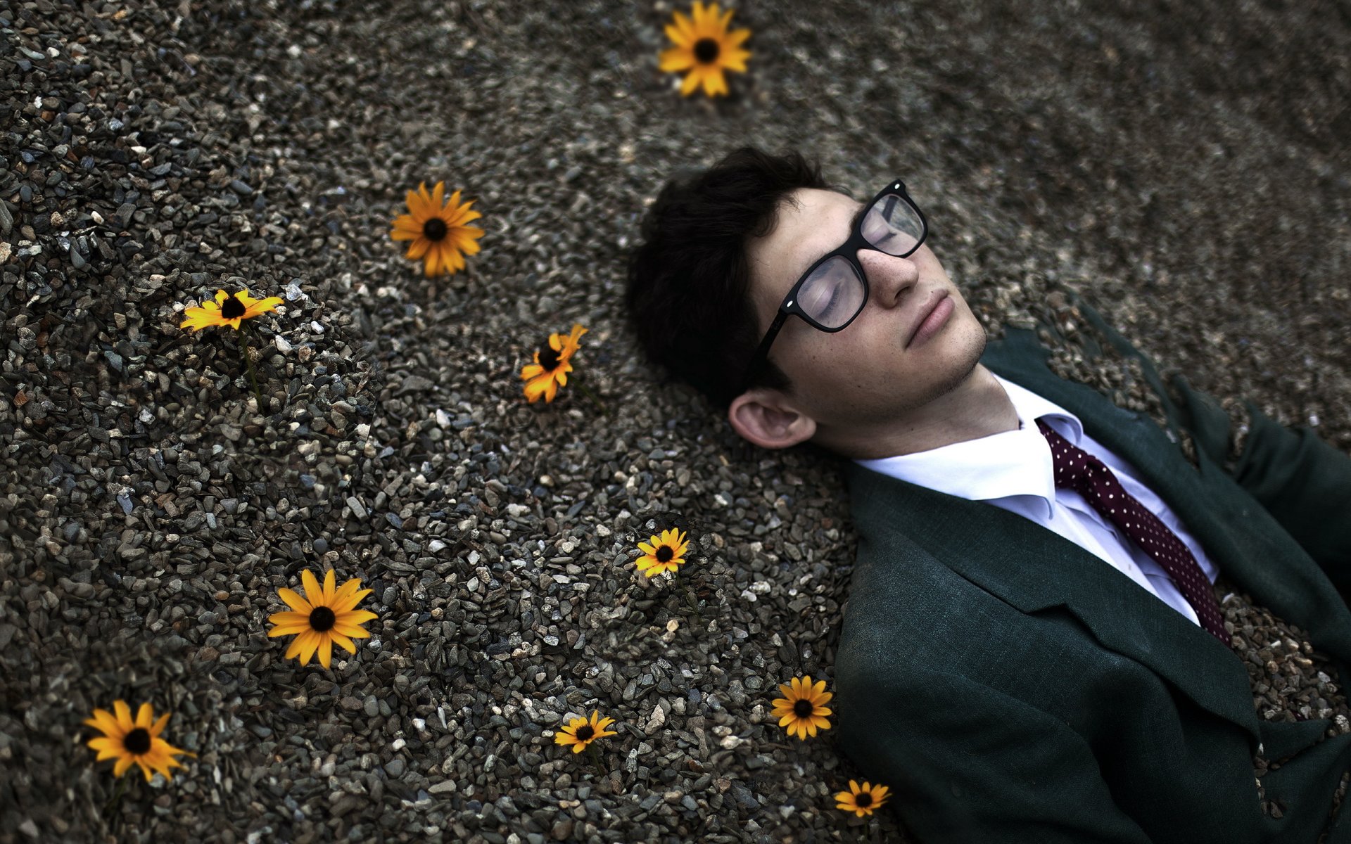Homme couché dans les pierres avec des fleurs orange - fond d'écran de bureau