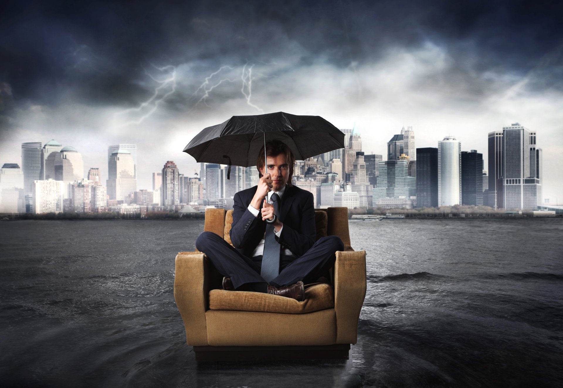 Homme en costume avec parapluie flotte sur une chaise - fond d'écran de bureau