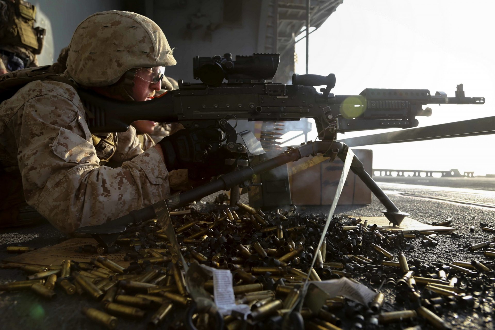 Soldat avec des armes se trouve sur le sol - fond d'écran de bureau