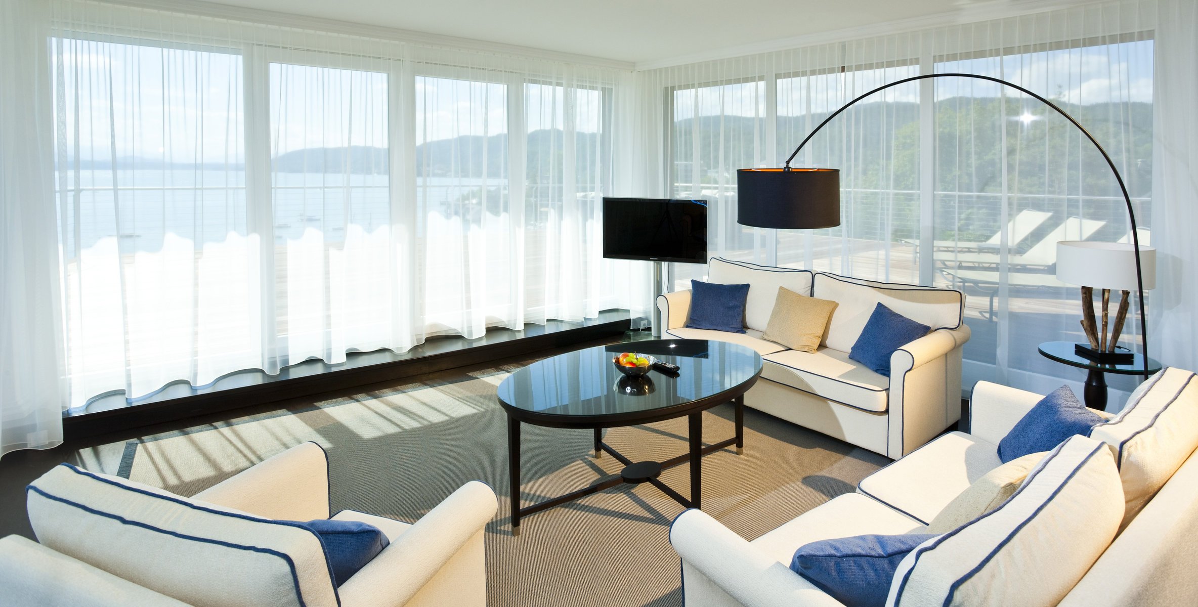 Salon lumineux à la mode avec fenêtres panoramiques - fond d'écran de bureau