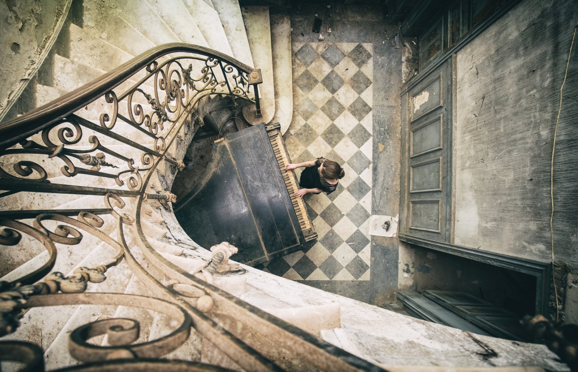 Fille jouant du piano dans une vieille maison - fond d'écran de bureau