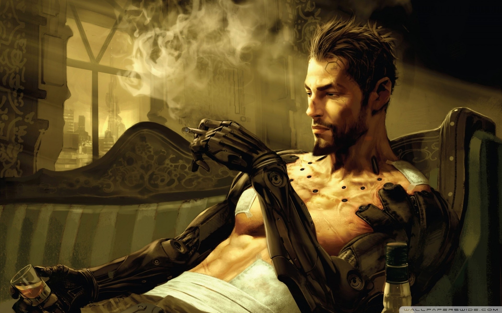Cyberpunk Adam Jensen sur le canapé - fond d'écran de bureau