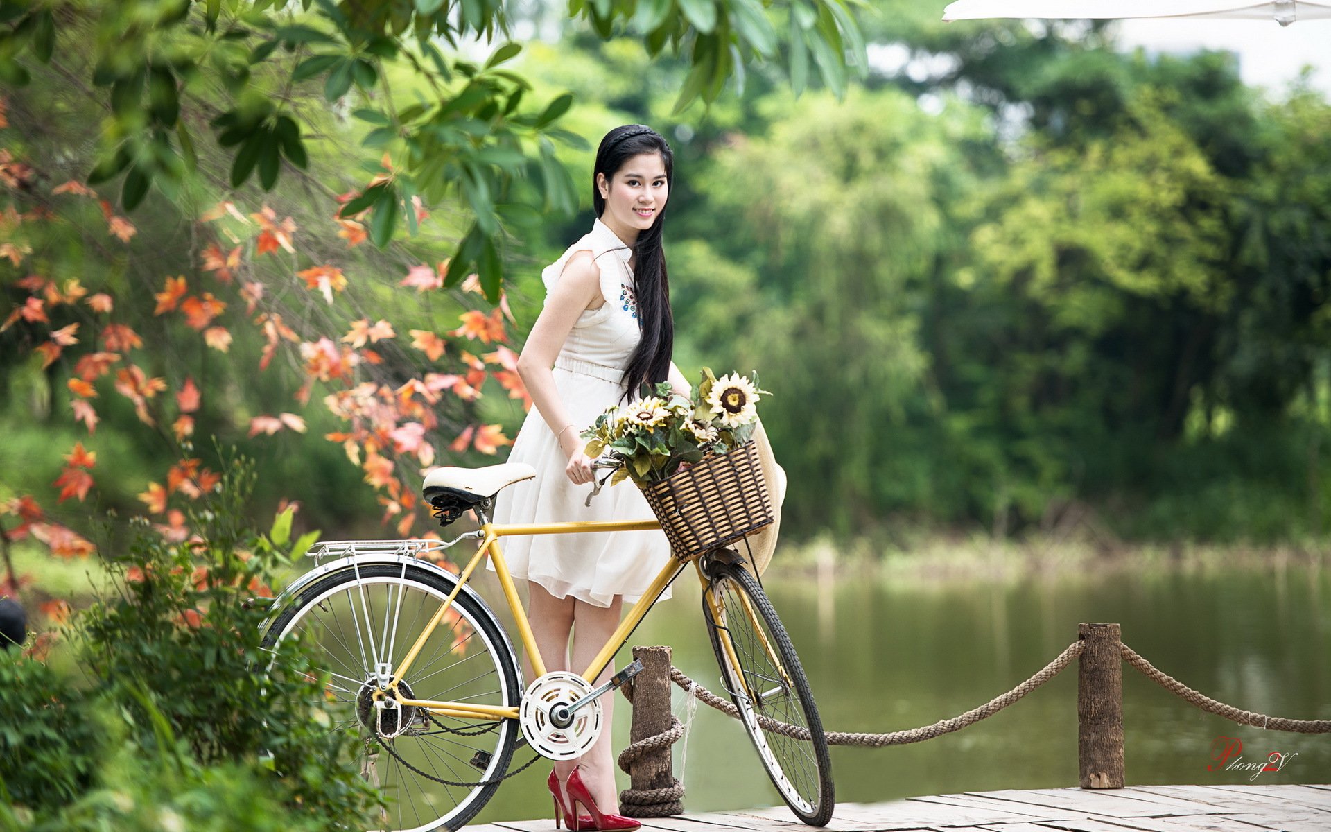 Asiatique en blanc pleurer sur le vélo - fond d'écran de bureau