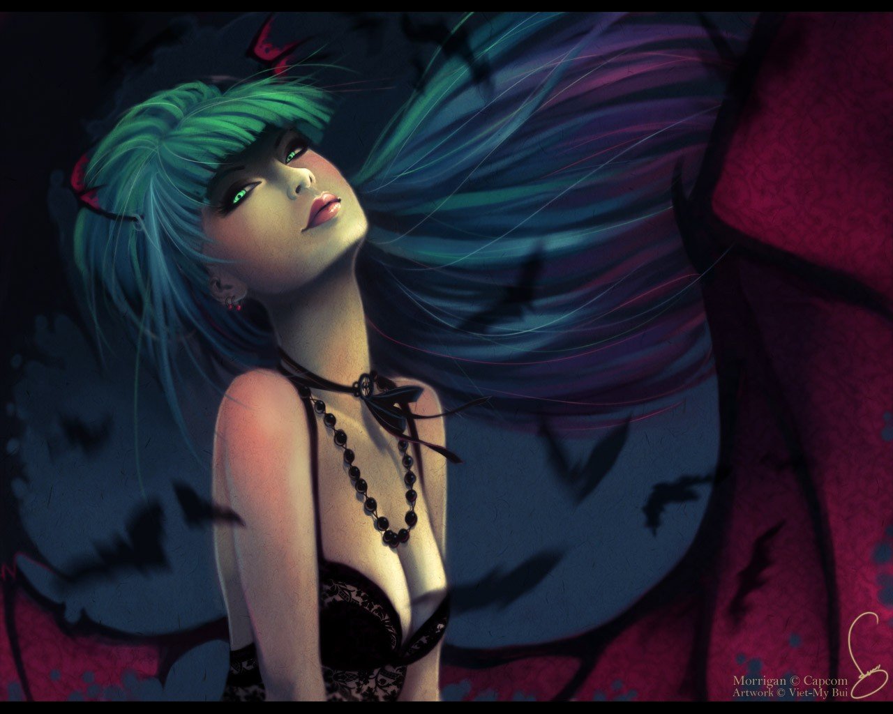 Dessin d une fille aux cheveux verts - fond d'écran de bureau