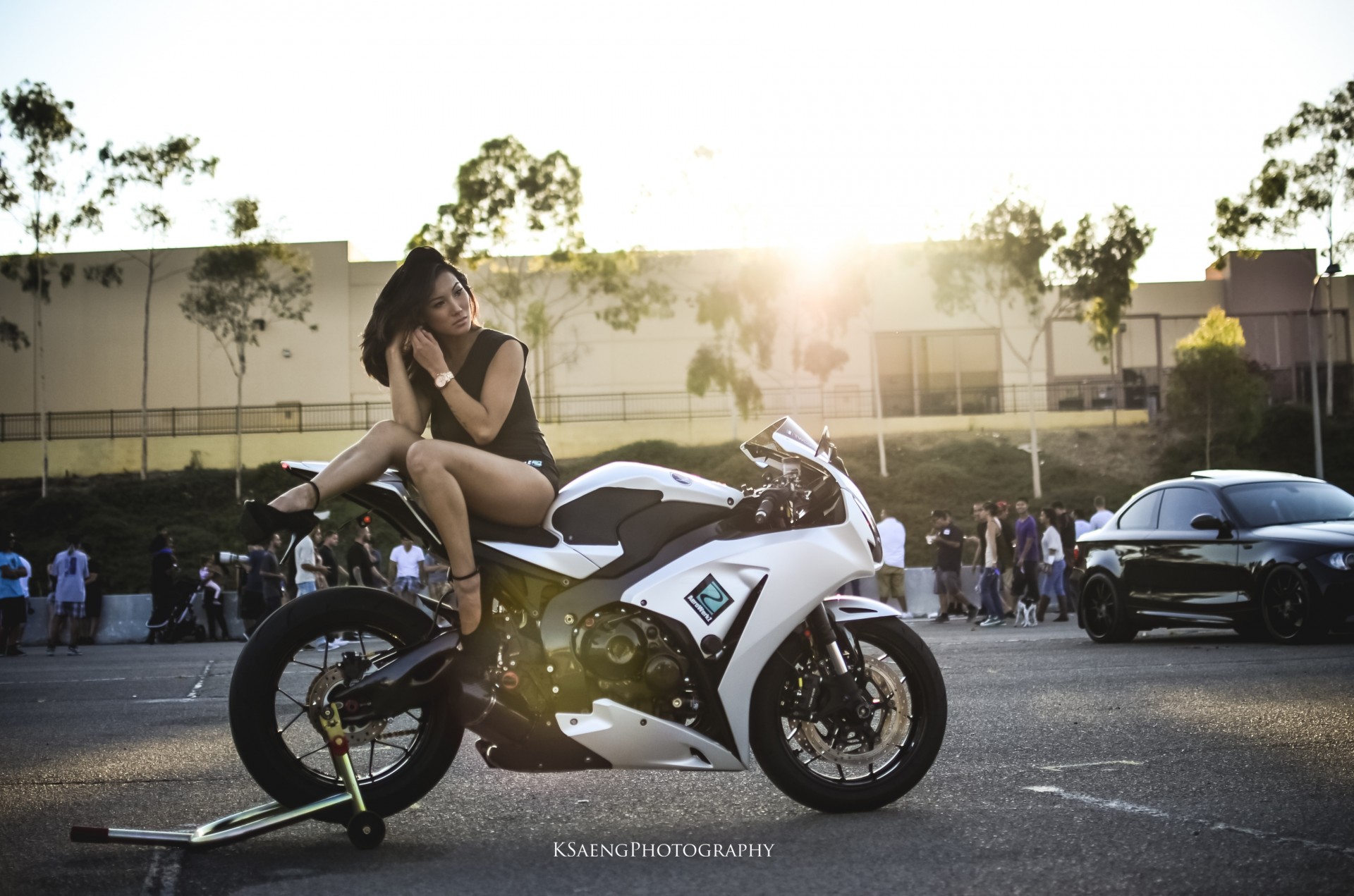 Fille Asiatique est bien assis sur un vélo en talons aiguilles - fond d'écran de bureau