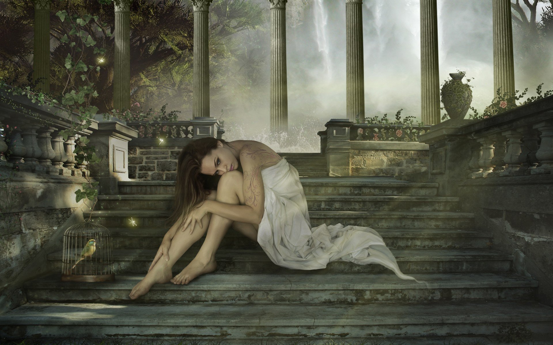 Fille assise sur les Marches dans un drap - fond d'écran de bureau