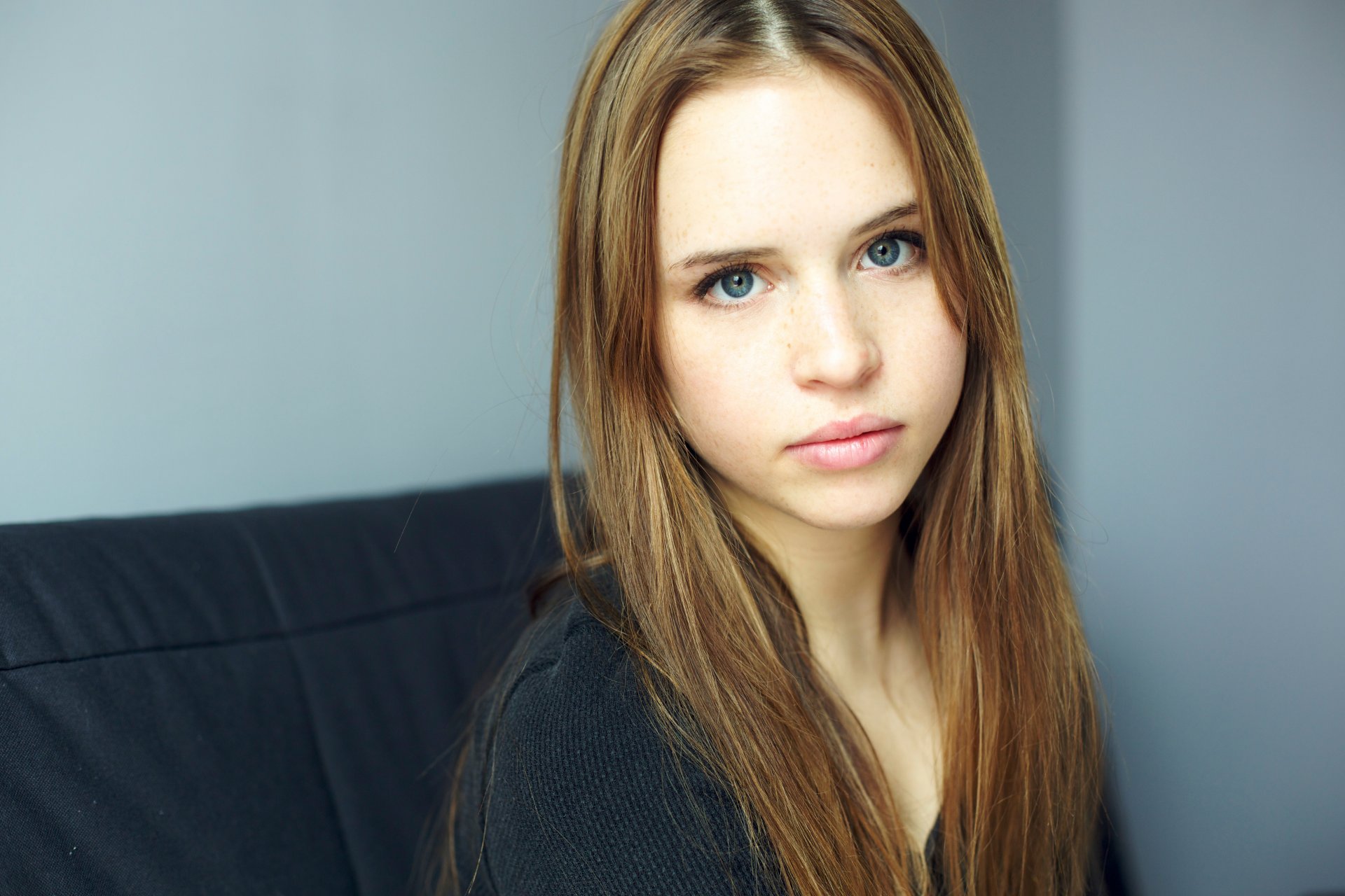 Fille aux yeux bleus regarde sérieusement la caméra - fond d'écran de bureau